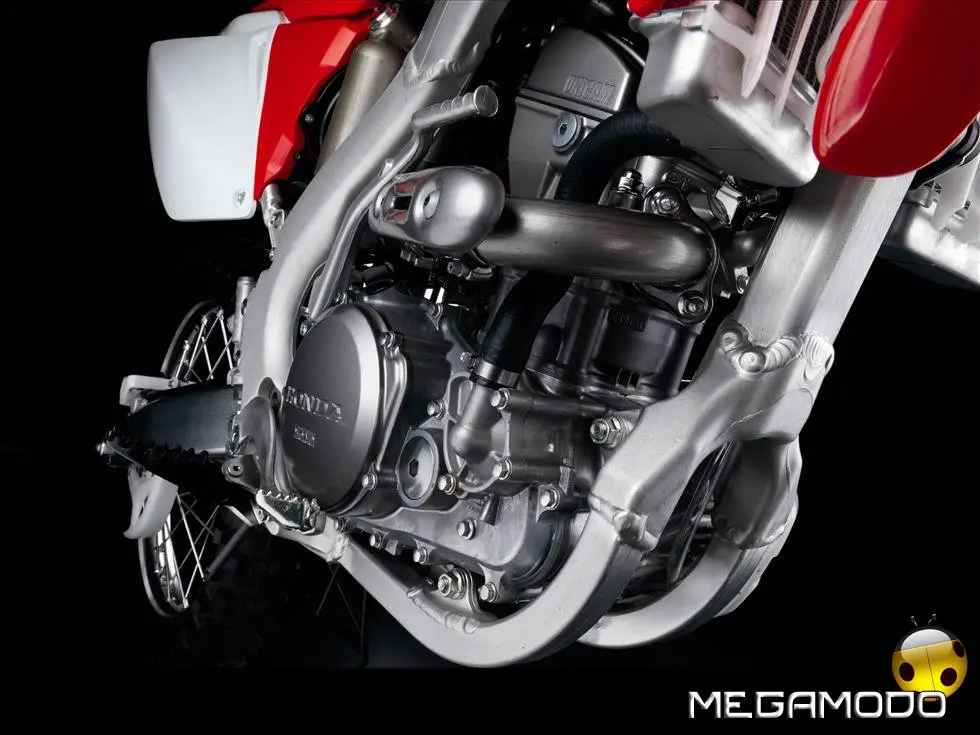 Motore/Trasmissione - Il potente motore 4 tempi 4 valvole Unicam 249cm³ raffreddato a liquido eroga una potenza ottimale a tutti i regimi. - L'innovativa distribuzione Unicam è caratterizzata da un'unità a camma singola leggera e compatta, e da una configurazione della camera di combustione che esalta l’efficienza del propulsore in tutta la curva d’erogazione. - La distribuzione Unicam, con singolo albero a camme carbocementato, attua direttamente le due valvole di aspirazione in titanio da 31 mm. Il lobo centrale dell’albero a camme comanda invece due valvole di scarico da 26mm mediante un bilanciere a forchetta con attriti ridotti. - Il leggerissimo e compatto decompressore interno, insieme alla levetta montata sul manubrio, garantisce messe in moto efficaci sia a motore freddo sia a caldo. - L’adozione di leggere valvole di aspirazione in titanio ha permesso di utilizzare molle più piccole, riducendo il peso complessivo del motore. - Contralbero di bilanciamento ed ingranaggi del cambio alleggeriti. - La frizione adotta molle più morbide per un’azione più fluida. - Carter frizione, carter alternatore e coperchio della testata in magnesio per ridurre il peso del propulsore. - Il pistone forgiato e le fasce elastiche sono più leggere del solito; garantiscono una risposta più reattiva del motore, che “sale” di giri più rapidamente, ed una buona tenuta del cilindro anche quando il rapporto di compressione di 13: 1 è così significativo da far raggiungere alla CRF una elevata potenza agli alti regimi. - Il leggero rivestimento in Nickel Carburo di Silicio (NiCaSil) del cilindro garantisce un funzionamento più silenzioso e regolare, che estende il ciclo vitale del motore. - Il carburatore Keihin FCR da 40mm presenta 4 rulli sulla valvola piatta, per una rapida accelerazione ad ogni piccola aperture del gas, con una pronta risposta ed un’eccellente guidabilità. - Il carburatore è equipaggiato con un sensore di posizione della manopola del gas (TPS), che aiuta a mantenere lineare la risposta del motore durante tutto l’arco di utilizzo. - La lubrificazione a doppia aspirazione separa l'afflusso dell'olio diretto ad albero motore, pistone e distribuzione da quello indirizzato verso frizione e cambio. Oltre a garantire una costante lubrificazione alla frizione, elimina la contaminazione dei materiali della trasmissione con l'olio motore, riducendo quindi la quantità di fluido in circolazione e le dimensioni della pompa. - Scarico con doppio silenziatore per centralizzare le masse e ridurre l’inerzia in curva, aumentando conseguentemente il feeling del pilota con la leggerezza della CRF250R. - I due terminali aumentano anche la coppia ai bassi regimi. - L’impianto di scarico sfrutta collettori in acciaio inossidabile e terminali in alluminio con cartuccia intercambiabile. - Bilanciere con ingranaggio condotto che contiene le vibrazioni, azionando nel contempo la pompa dell'acqua. - La frizione con 8 dischi fornisce un’ampia superficie per gestire al meglio l’elevata coppia del motore, mentre l’azionamento della leva, grazie a molle più piccole, risulta leggero e progressivo. - Robusto cambio a cinque marce con rapporti ravvicinati.