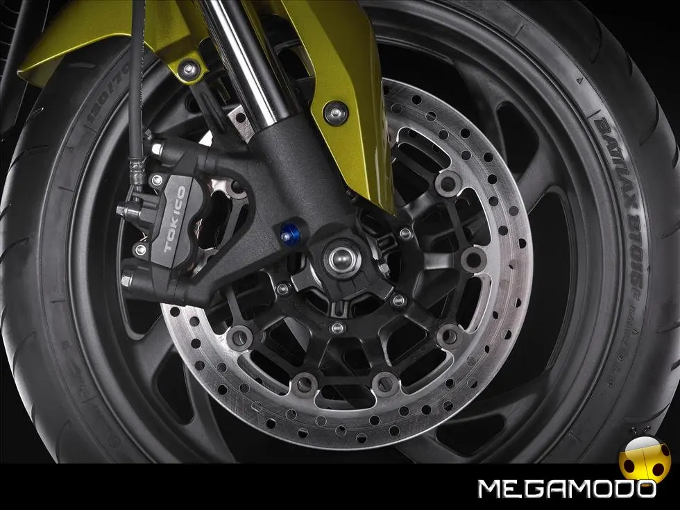 Versione con ABS e Frenata Combinata La nuova CB1000R è disponibile anche in una configurazione avanzata con ABS combinato che unisce il controllo di frenata ottimale del collaudato Sistema di Frenata Combinata Honda alla garanzia di sicurezza dell’ABS. Esteticamente, sono le pinze e la pressofusione nella parte bassa della forcella a fare l’unica vera differenza tra la versione standard e quella con ABS combinato. Al posto delle pinze radiali a quattro pistoncini e alte prestazioni della versione standard, c’è un set di pinze color oro a tre pistoncini che agiscono sugli stessi rotori flottanti da 310 mm. Sul lato destro di ogni ruota è installato anche un piccolo anello a impulsi, costantemente monitorato dal Sistema Antibloccaggio. L’ABS dell'ottimo sistema di Antibloccaggio e Frenata Combinata in dotazione alla CB1000R funziona esattamente come quello installato sugli altri modelli Honda. Quando si frena su superfici non irregolari o scivolose, questo sistema ad alta precisione reagisce istantaneamente anche alle minime variazioni della velocità relativa delle due ruote, contrastando il possibile slittamento dello pneumatico prima che questo possa aver luogo. Grazie alla precisione del controllo, il sistema mantiene la giusta pressione frenante per una decelerazione leggera e progressiva, che trasmette al pilota la certezza di poter frenare rapidamente e in tutta sicurezza.