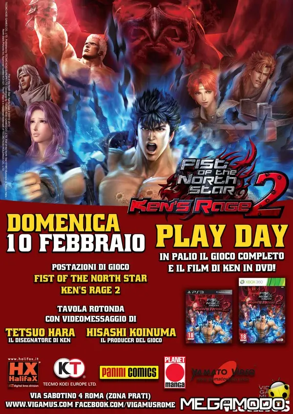 “Mai mai scorderai l’attimo, la terra che tremò... l’aria s’incendiò... e poi silenzio...” In occasione dell'uscita di Fist of the North Star: Ken's Rage 2, VIGAMUS organizza una giornata interamente dedicata al successore della Sacra Scuola di Hokuto. L'appuntamento con KEN'S RAGE 2: PLAY DAY è fissato per il prossimo 10 febbraio. Per tutta la durata dell'evento, organizzato in collaborazione con TECMO KOEI, Halifax, Panini e Yamato Video, sarà possibile accedere alle postazioni di gioco gratuite di Fist of the North Star: Ken's Rage 2, il nuovo videogioco dedicato al mitico Ken, pubblicato da TECMO KOEI e distribuito in Italia da HALIFAX.