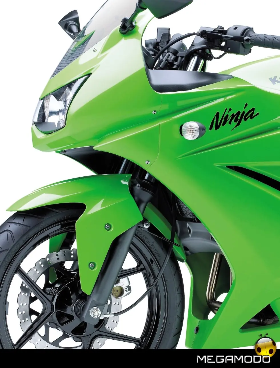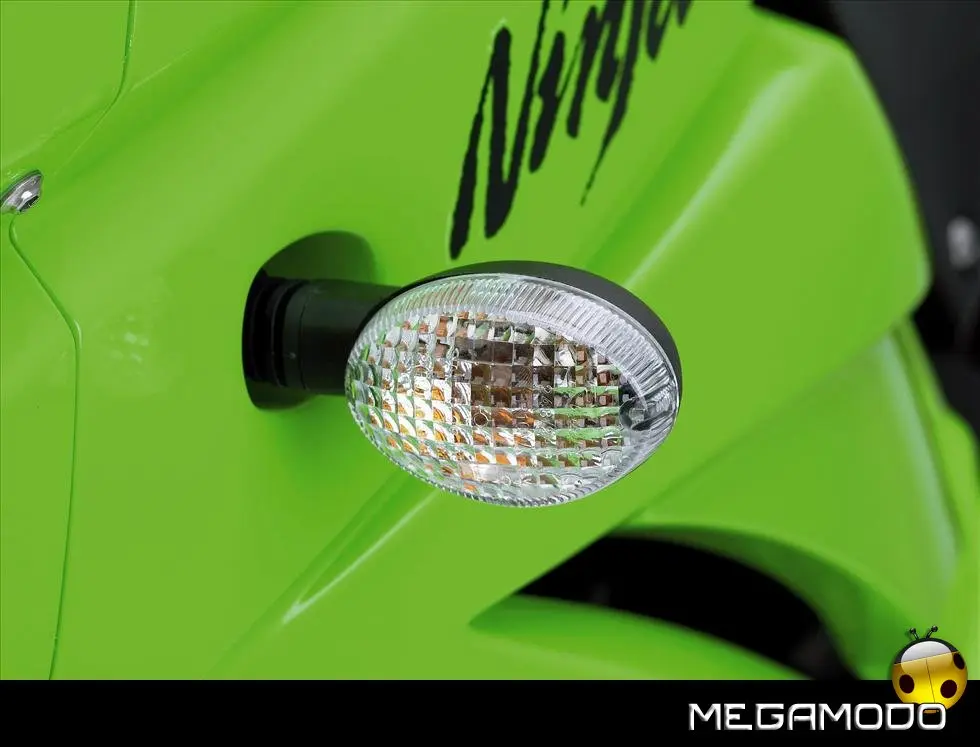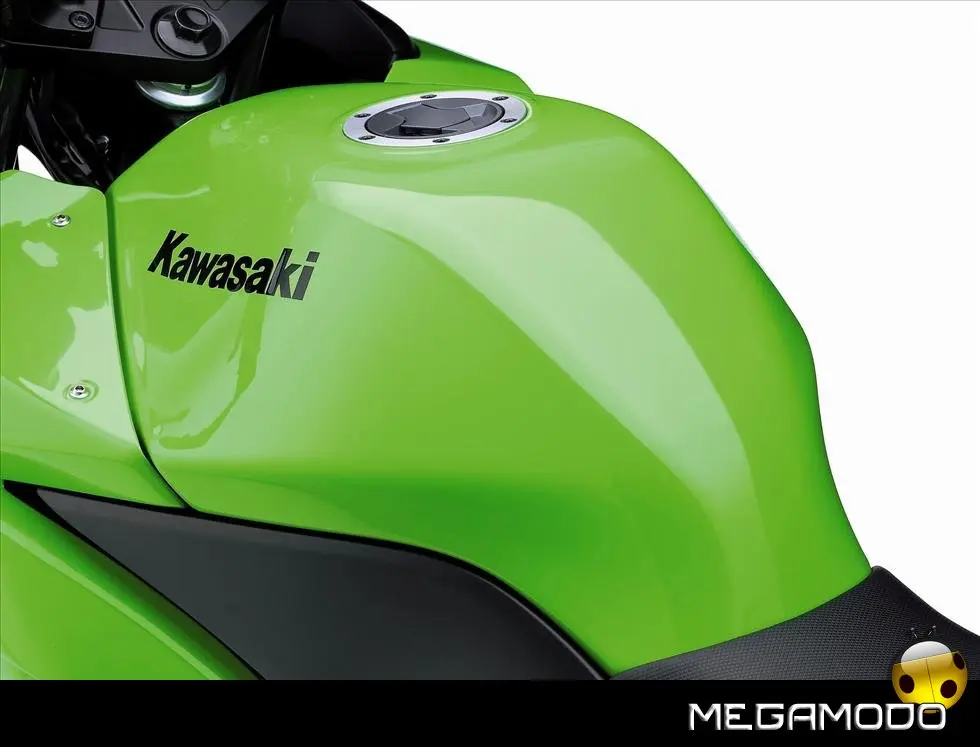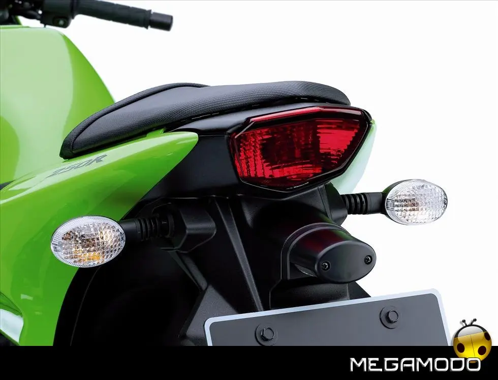 Scocca: - La scocca voluminosa conferisce alla 250R l’aspetto di una moto di cilindrata superiore. - Le linee audaci alludono al carattere sportivo di questo modello. - La carena anteriore e il parabrezza offrono al pilota una notevole protezione dal vento. - Il design aggressivo del fanale a due lampade rafforza l’aspetto unico della Ninja 250R. - Gli indicatori di direzione dal vetro chiaro comunicano l’alta qualità dei materiali usati in questa moto. - La carena con coda di dimensioni ridotte e le selle separate ne evidenziano ulteriormente l’aspetto supersportivo. - La copertura per sella singola opzionale può sostituire la sella doppia per un aspetto ancora più aggressivo. - Il taglio e la finitura sono equivalenti a quelli dei modelli Ninja supersport di prima categoria.