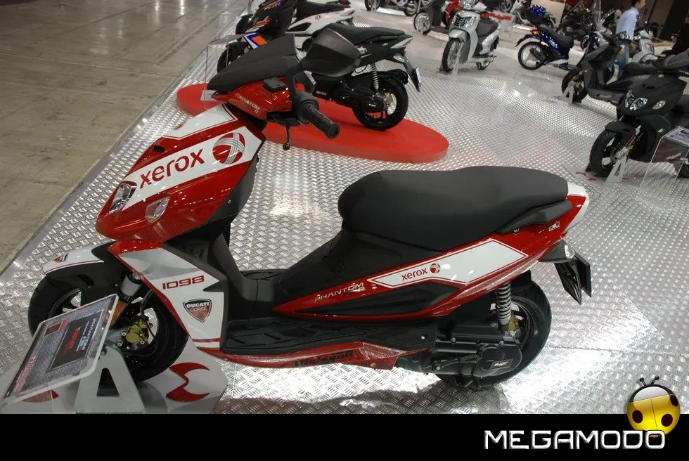 Giochi cromatici nuovi per Il Phantom F12 R 50cc che si presenta con una grafica rinnovata studiata per la sola versione liquid cooled che ne esalta a linea grintosa e giovanile. Base nera mat e grafiche che richiamano il mondo aeronautico con fregi che suggeriscono dinamicità e velocità e l’aereo che evoca il nome Phantom. Il risultato è un design nuovo per uno scooter frizzante e dalla forte personalità. Cruscotto digitale anch’esso di stile aeronautico multifunzione con display a cristalli liquidi che incorpora le seguenti funzioni: velocità istantanea media e massima, contagiri, contachilometri totale e parziale, orologio e cronometro, barra grafica del livello carburante. Per conferire un’ottima maneggevolezza e una guida intuitiva e veloce, Phantom F12 R 50cc Fantasy l.c. è equipaggiato con cerchi da 13” di diametro, pneumatici tubeless extralarge (anteriore 130/60, posteriore 140/60 e monta sia all’anteriore che al posteriore freni a disco a margherita da 190mm di diametro con trasmissione idraulica che garantiscono un maggior controllo in frenata anche in spazi ridotti. Sicurezza e praticità fanno del nuovo Phantom F12 R il migliore amico dei giovani; anello d’acciaio saldato al telaio per il fissaggio della catena antifurto e pratico gancio portaborse nel retro scudo.