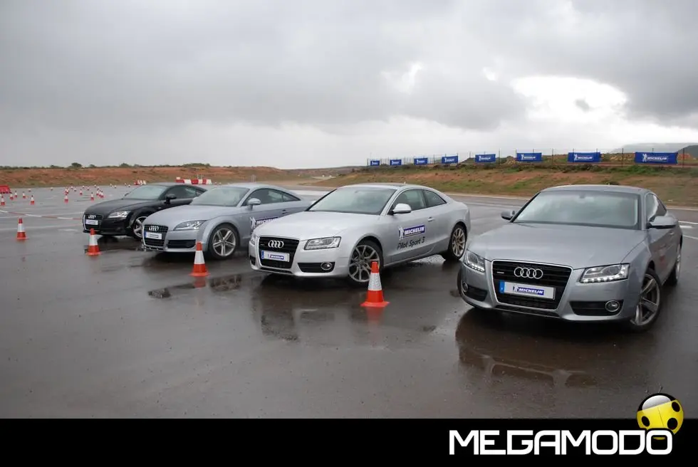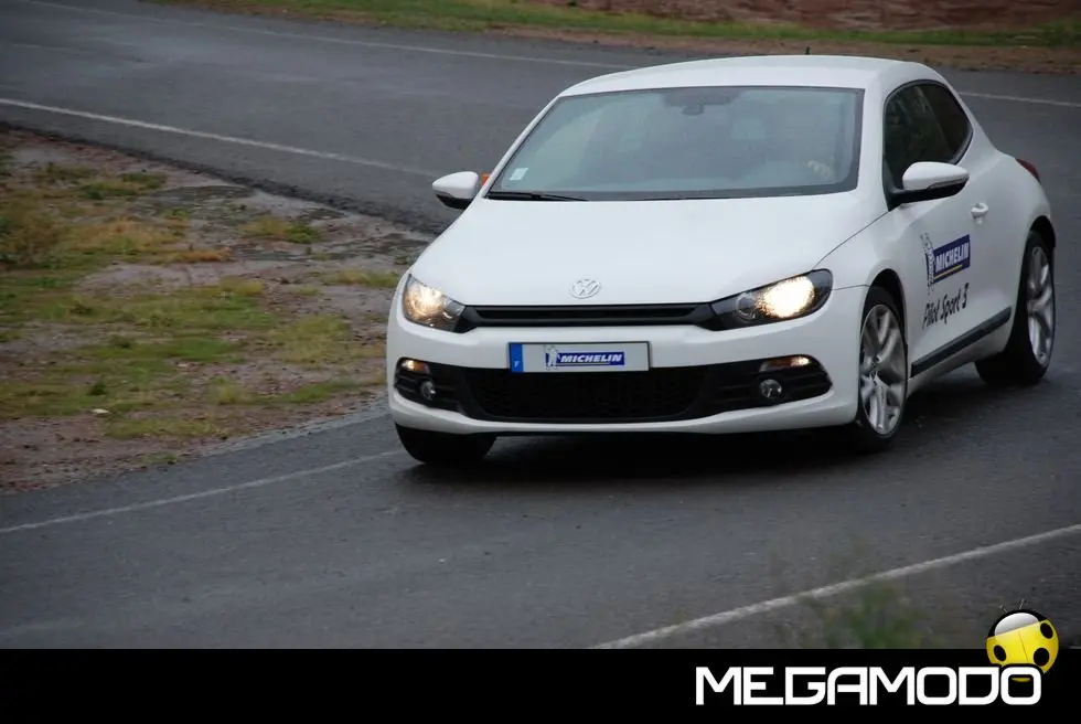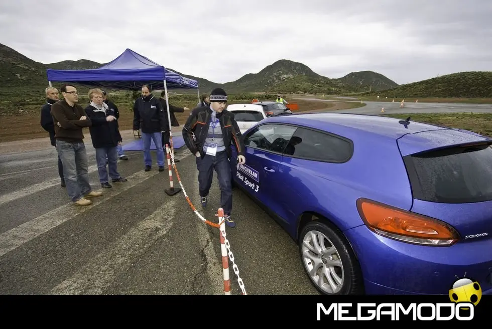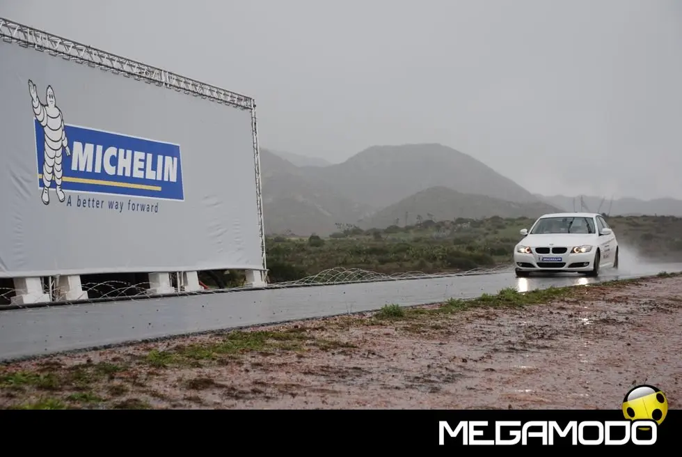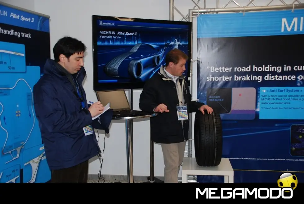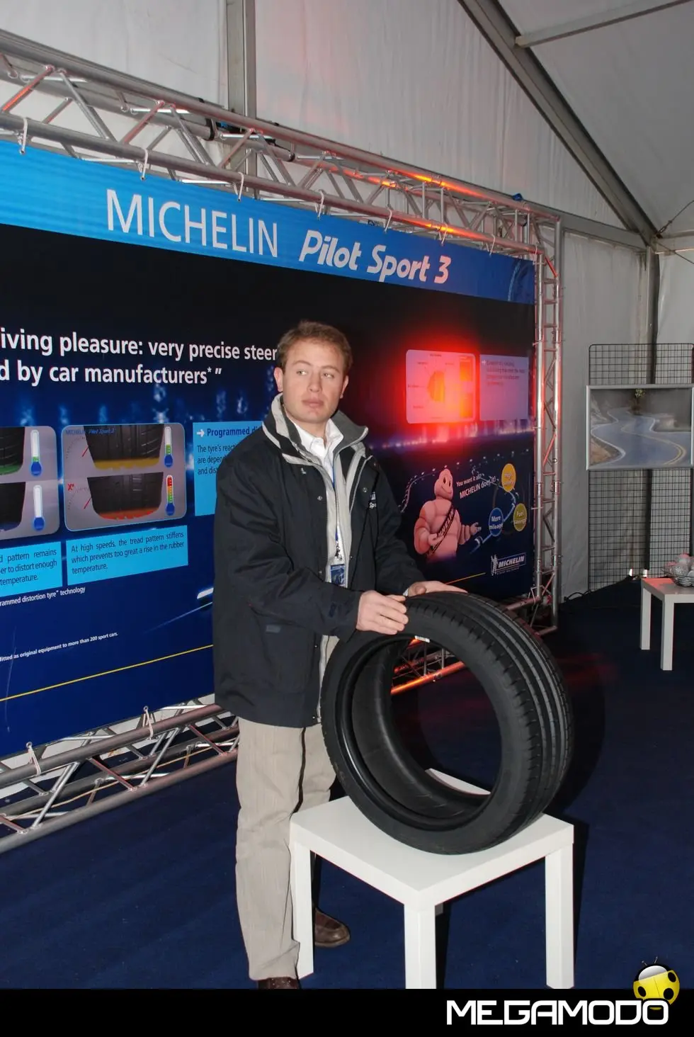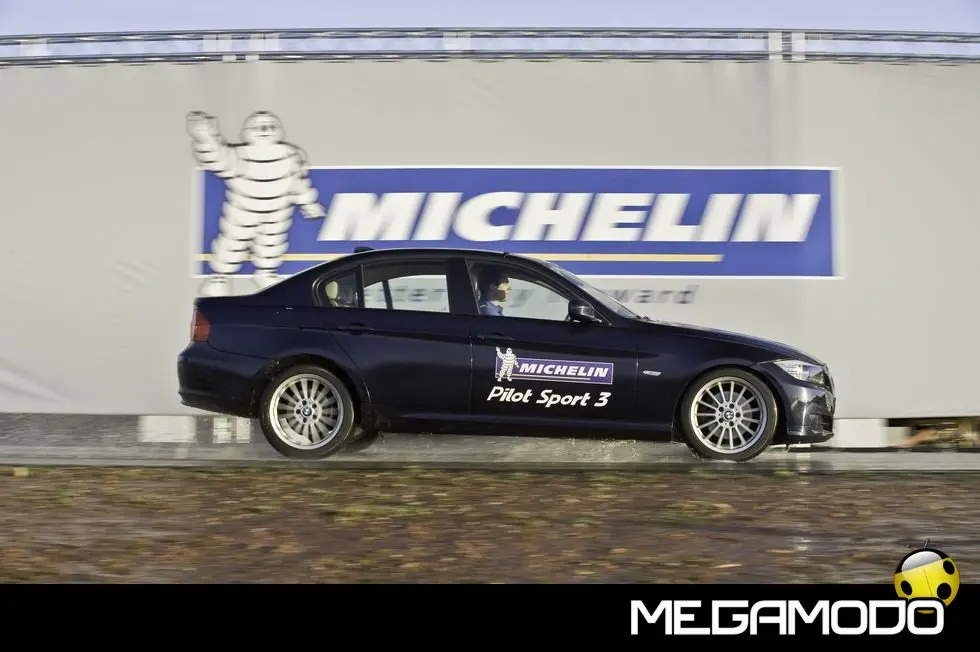 Strabiliati dalla visita del centro, ci siamo recati sul primo dei 4 campi di prova del nuovo PS3. Qui ci attendevano tecnici e collaudatori per illustrarci il tipo di prova che avremmo dovuto affrontare. 5 temibili concorrenti erano in gara: Bridgestone RE050(A), Pirelli Pzero, Continental Sport Contact 3, Dunlop Sport Maxx TT, Goodyear Eagle F1 Asymmetric. Controllo accurato della pressione di ogni pneumatico e via!! Com’è andata? Il verdetto è stato quanto mai chiaro: per trovare un prodotto capace di battere il PS3 bisogna faticare tanto. Il Pilot Sport 3 ha dimostrato di essere una spanna sopra tutti in qualsiasi condizione di lavoro (pista, strada, asciutto, bagnato, in frenata) e con qualsiasi categoria di veicolo: aderenza, precisione, reattività, sicurezza e consumi attualmente senza pari. Su strada bagnata, migliore tenuta in curva e spazi di frenata da 80 a 10 km/h inferiori di tre metri rispetto alla concorrenza (confermati dal sistema di rilevamento V-Box Mini della Racelogic). L’Eagle F1 Asymmetric è risultato il miglior sfidante. A questo, si aggiunge un’altissima precisione di risposta del volante, fonte di piacere di guida. Ciò ha permesso a Michelin di definire il suo nuovo pneumatico l’ «amplificatore di sensazioni».