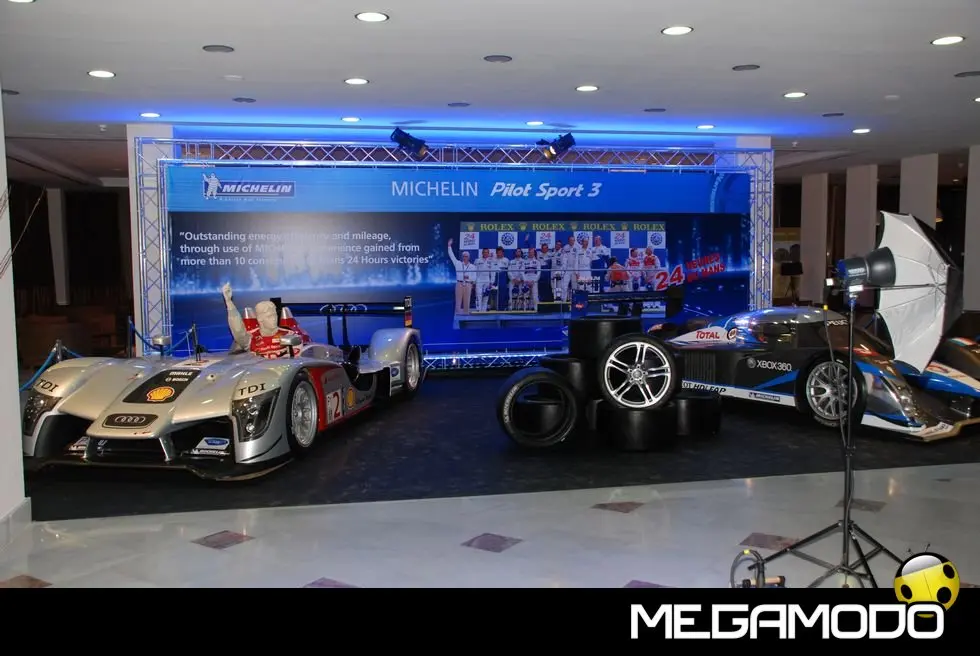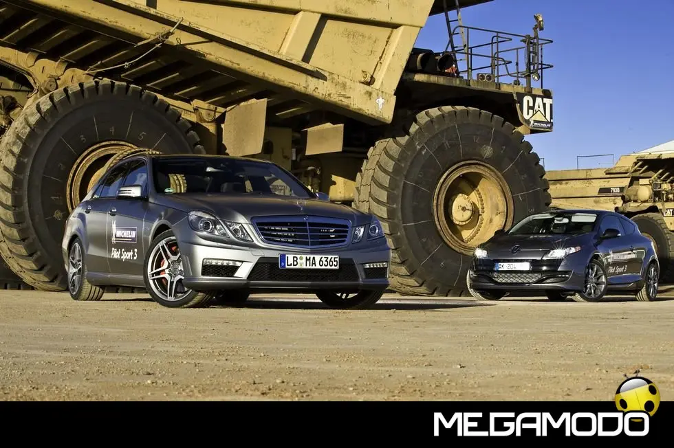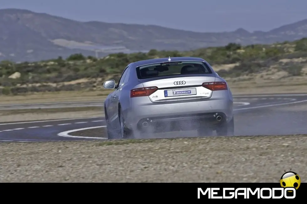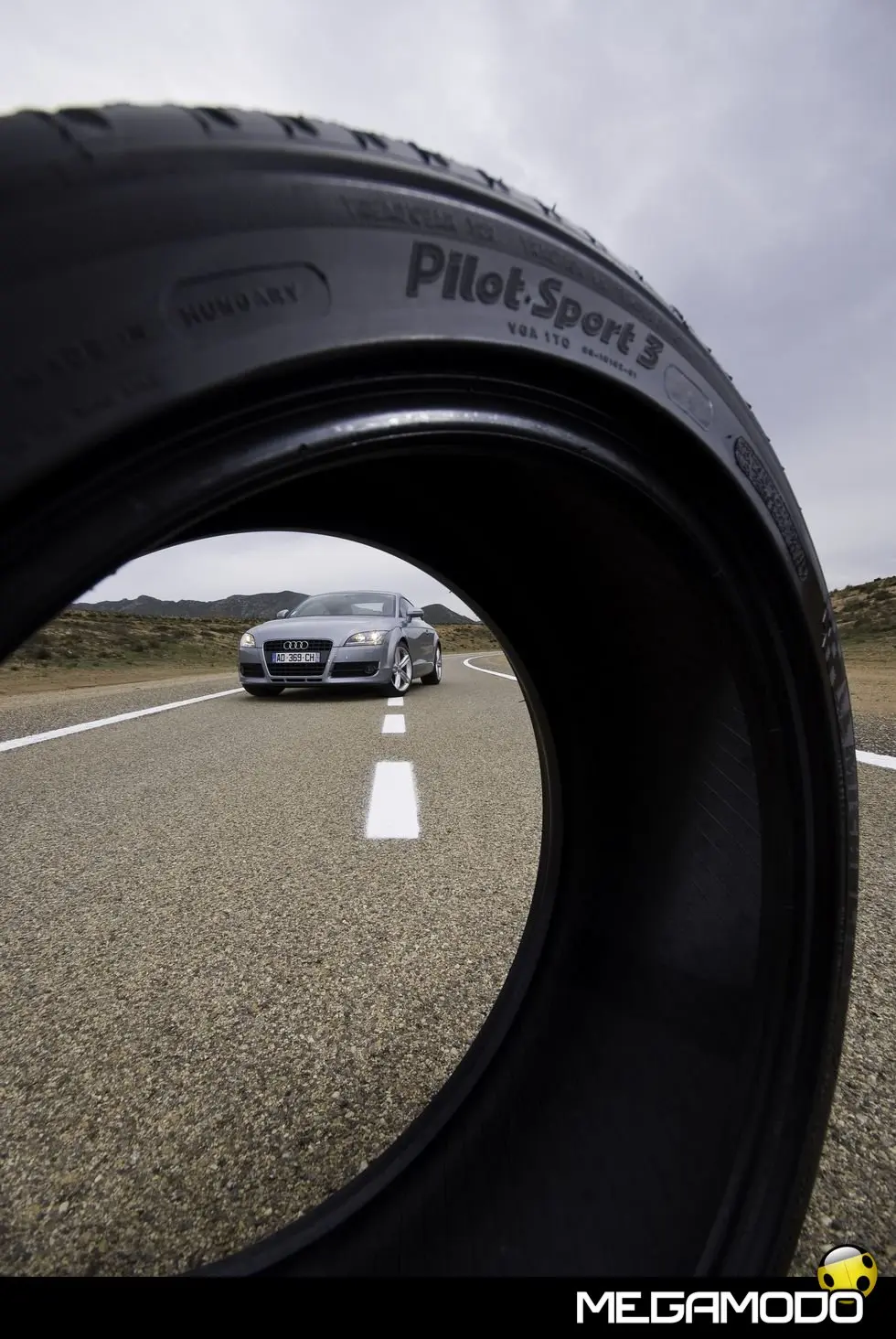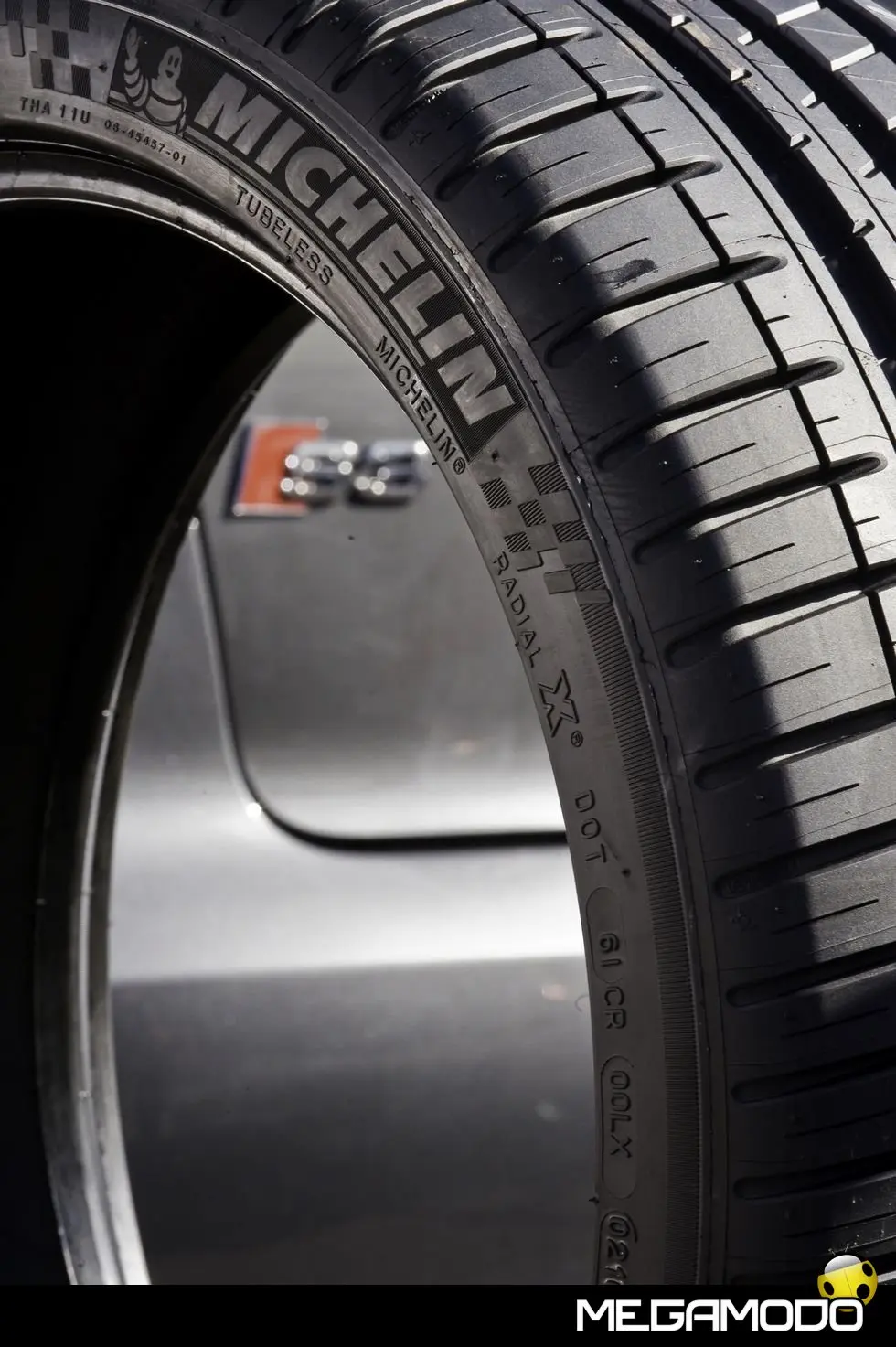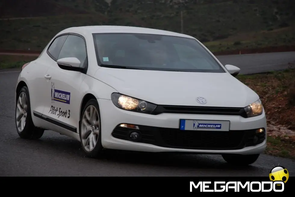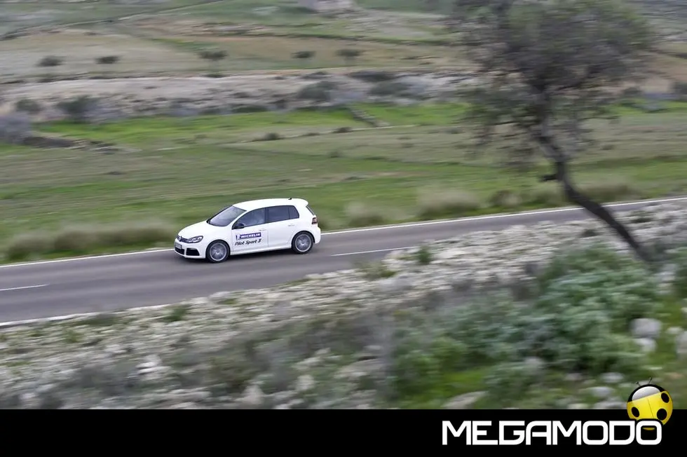 Strabiliati dalla visita del centro, ci siamo recati sul primo dei 4 campi di prova del nuovo PS3. Qui ci attendevano tecnici e collaudatori per illustrarci il tipo di prova che avremmo dovuto affrontare. 5 temibili concorrenti erano in gara: Bridgestone RE050(A), Pirelli Pzero, Continental Sport Contact 3, Dunlop Sport Maxx TT, Goodyear Eagle F1 Asymmetric. Controllo accurato della pressione di ogni pneumatico e via!! Com’è andata? Il verdetto è stato quanto mai chiaro: per trovare un prodotto capace di battere il PS3 bisogna faticare tanto. Il Pilot Sport 3 ha dimostrato di essere una spanna sopra tutti in qualsiasi condizione di lavoro (pista, strada, asciutto, bagnato, in frenata) e con qualsiasi categoria di veicolo: aderenza, precisione, reattività, sicurezza e consumi attualmente senza pari. Su strada bagnata, migliore tenuta in curva e spazi di frenata da 80 a 10 km/h inferiori di tre metri rispetto alla concorrenza (confermati dal sistema di rilevamento V-Box Mini della Racelogic). L’Eagle F1 Asymmetric è risultato il miglior sfidante. A questo, si aggiunge un’altissima precisione di risposta del volante, fonte di piacere di guida. Ciò ha permesso a Michelin di definire il suo nuovo pneumatico l’ «amplificatore di sensazioni».
