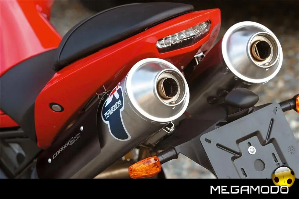 Il posteriore è caratterizzato da un forcellone asimmetrico che nasconde un monoammortizzatore Ohlins con serbatoio separato pluriregolabile in lunghezza, precarico, estensione e compressione. In frenata la Corsaro 1200 Veloce non delude le aspettative: gli impianti Brembo Serie Oro garantiscono decelerazioni potenti e progressive regalando al pilota tutta la sensibilità necessaria per gestire al meglio questa difficile fase della guida. All’anteriore coppia di dischi da 320mm con pompa radiale e pinze a quattro pistoncini: una soluzione che risponde ad un preciso input tecnico, quello di offrire sicurezza grazie ad una modulabilità da riferimento ed una grande potenza. L’impianto frenante posteriore prevede un disco da 220 mm e pinza a due pistoncini. L’impianto di scarico si distingue per i due silenziatori Termignoni in puro stile racing, sottili e leggeri, che regalano un sound di tonalità potente, rispettando le normative per l’omologazione Euro 3.