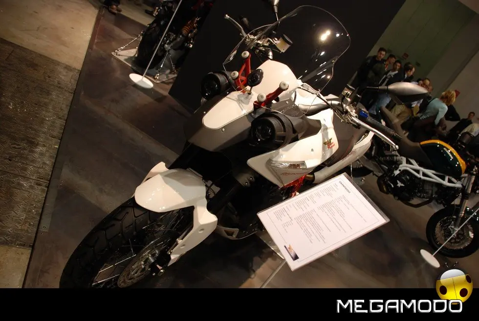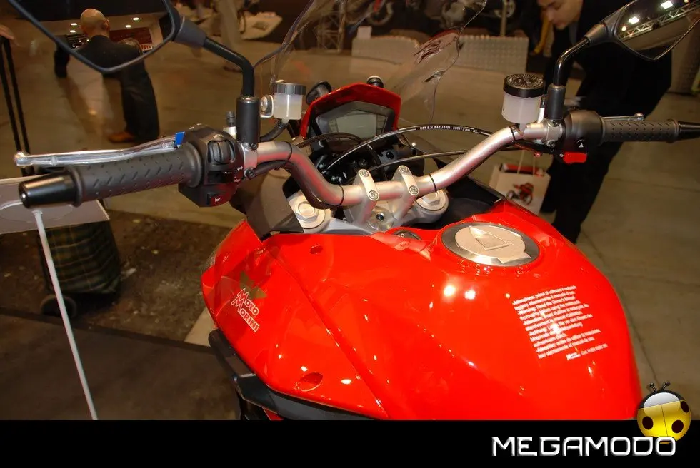 IL FORCELLONE E LA SOSPENSIONE. Il lavoro del telaio è coadiuvato da sospensioni di ottimo livello. All’anteriore una possente Marzocchi Magnum con steli rovesciatida 50mm di diametro, stretta da piastre realizzate in fusione di lega leggera. Il posteriore è caratterizzato da un poderoso forcellone bibraccio realizzato in idroformatura, una innovativa tecnologia costruttiva, che si basa sulla capacità deformante della forza idrica e che consente la produzione di manufatti senza saldature. Il forcellone realizzato con questa tecnologia presenta vantaggi in termini di peso, ma soprattutto di rigidezza strutturale. È coadiuvato da un monoammortizzatore laterale hlins con serbatoio piggyback, pluriregolabile con dispositivo remoto esterno in lunghezza, pre-carico, estensionee compressione. I CERCHI E GLI PNEUMATICI. I cerchi Excel a raggi con canale in lega di alluminio consentono il montaggio di pneumatici tubeless di ultima generazione, gomme polivale nticon mescole che assicurano un eccellente grip sull’asciutto e sul bagnato, per affrontarein assoluta sicurezza viaggi di lunga durata in condizioni climatiche diverse, anche a pieno carico. L’IMPIANTO FRENANTE. Gli impianti Brembo con pompa radiale garantisconodecelerazioni potenti e progressive regalando al pilota tutta la sensibilità necessaria per gestire al meglio questa difficile fase della guida. La coppia di dischi semiflottanti con diametro da 298 mm all’anteriore è lavorata da pinze flottanti a 2 pistoncini, soluzione che assicura allo stesso tempo potenza e modulabilità, apprezzabile su qualsiasi asfalto e soprattutto in presenza di fondi con scarsa aderenza. Al posteriore monodisco da 255 mm con pinza flottante a 2 pistoncini. IL SERBATOIO. Il serbatoio carburante è realizzato da Acerbis e rispetta le norme omologative europee e statunitensi, ha una capacità di 27 litri ed è sollevabile per avereaccesso alla grande scatola filtro sottostante. IL CRUSCOTTO. Di piccole dimensioni e ben integrato con il cupolino, il cruscotto digitale è completo e perfettamente leggibile. I comandi sono facili da raggiungere perché posti sulla manopola; tra le altre funzioni della strumentazione si possono visualizzare temperatura esterna, marcia inserita, orologio e intervalli di manutenzione. L’IMPIANTO DI SCARICO. Realizzato in acciaio inox, è perfettamente integrato nel disegno della moto, divenendone un elemento caratterizzante. Il sound del bicilindrico Bialbero Corsacorta è pieno e possente ma, grazie ad una messa a punto meticolosa e alla tecnologia del closed loop con catalizzatore trivalente e sonda lambda, rispetta l’ambiente posizionandosi al di sotto dei limiti di emissioni di scarico imposti dalla severa normativa antinquinamento Euro 3.