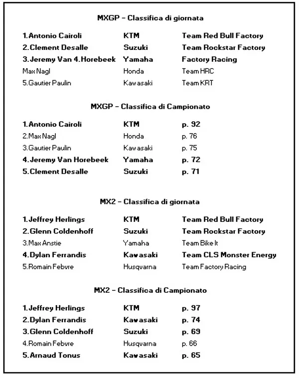 Doppia vittoria anche nella MX2, grazie all’ufficiale KTM Jeffrey Herlings che ha dato un’ennesima dimostrazione del suo talento con due decise affermazioni che gli hanno permesso di avere la meglio sul sorprendente olandese Glenn Coldenhoff passato quest’anno alla guida della Suzuki. Ad un soffio dal podio il francese rivelazione dell’anno Dylan Ferrandis, che dopo essersi lasciato alle spalle Herlings nella manche di prove cronometrare in gara si è piazzato al quarto posto assoluto grazie al quale ha consolidato il suo secondo posto nella classifica provvisoria di campionato.