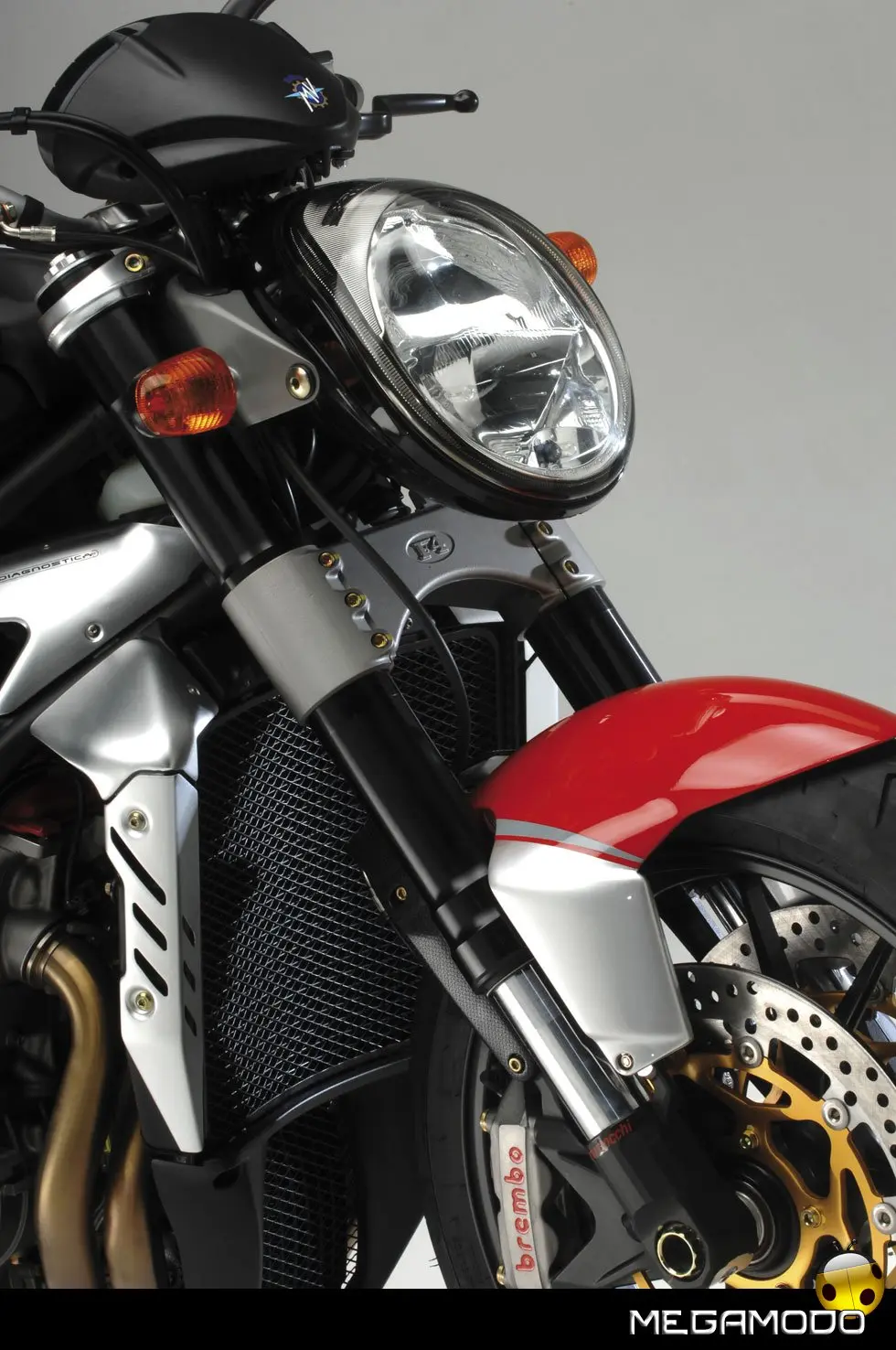 Le spalle larghe, i fianchi snelli e l’impugnatura larga del manubrio, comunicano potenza e forza muscolare, infondendo quello stato di gratificazione e appagamento al pilota ancora prima di girare la chiave, mettendo così in moto l’impeto MV. Brutale fa sognare quando si guarda, rabbrividire quando si ascolta, appassionare quando si guida. La 1078RR, oltre che moto, è il prolungamento della personalità di chi ha le due ruote nel cuore: capace di far sentire esclusivo colui che desidera esserlo, coraggioso chi cerca l’eccesso nella guida al limite, fuori dai rigori chi sceglie una moto non solo per ruotare la manopola del gas. Con la 1078RR niente è normale: i fotogrammi della vita quotidiana sono più veloci, colorati, musicali. La vivacità fa parte di lei. E oggi, con la nuova cilindrata a stravolgere il carattere, chiede ancora di più a sospensioni e freni, li vuole più efficaci, funzionali, rigorosi, per ritrovare quelle proporzioni nella guida che da sempre contraddistinguono i modelli MV Agusta. Con la certezza che, 1 078RR, sarà la nuova regina delle naked.