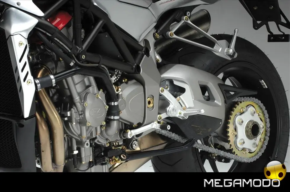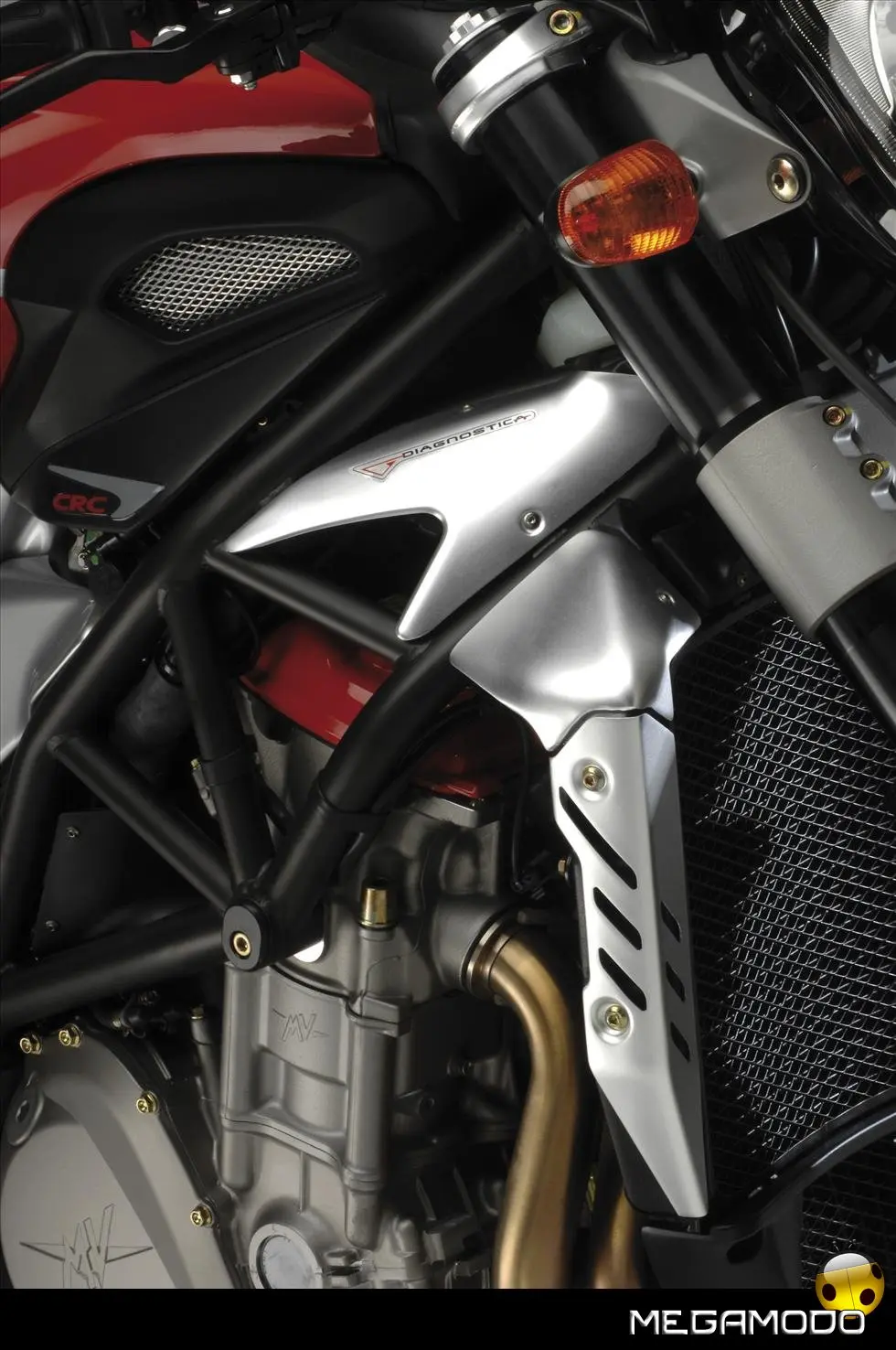 Conservare il telaio a traliccio realizzato al cromo molibdeno è una scelta di MV Agusta: ha un forte valore estetico, sopporta meravigliosamente la potenza del motore, riconfigurato fra cilindrata e cavalli, e, per ultimo, facilita gli interventi tecnici qualora le mani debbano raggiungere gli angoli più nascosti della moto. Già nella prima versione, con motorizzazione 750, Brutale era stata concepita per sopportare carichi di torsione e di flessione superiori rispetto allo stress in principio. Perché si pensava di arrivare, per gradi, fino a quest’ultimo traguardo.