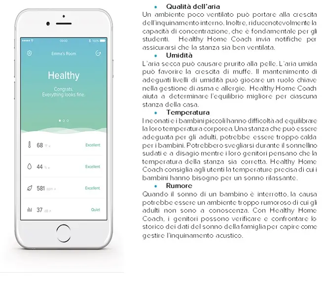 Healthy Home Coach è stato progettato per aiutare a fornire un ambiente più sano alle famiglie con bambini. “Che si tratti di livelli di rumore per un sonno ottimale, o dei giusti livelli di umidità per un bambino con l’asma, Healthy Home Coach misura quello che conta, mette in evidenza quali sono i potenziali problemi e consiglia all’utente come risolverli.” spiega Fred Potter, fondatore e CEO di Netatmo.