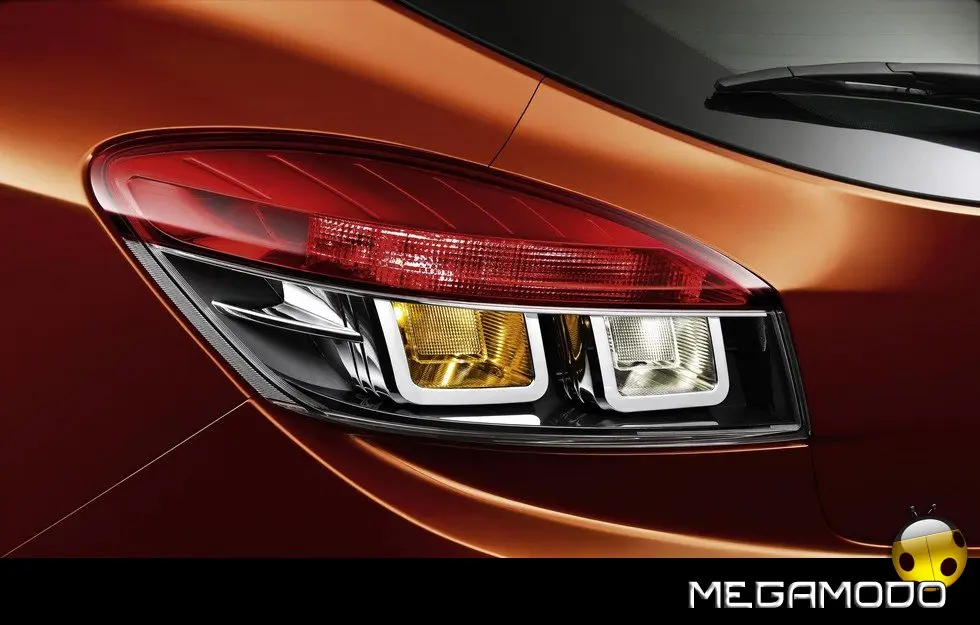 Coupé passione Il riferimento ai codici della passione automobilistica è accentuato su New Mégane Coupé. Sul frontale, molto dinamico, il modello adotta una calandra con prese dinamiche laterali dalle finiture in cromo satinato che inquadrano il logo ed una presa d’aria centrale valorizzata da una traversa in tinta nero opaco. I proiettori, disposti nel prolungamento delle due prese dinamiche, conferiscono all’auto un’identità forte e decisa. Le nervature del cofano si dirigono verso i montanti anteriori e si prolungano nel parabrezza inclinato e nel padiglione spiovente, accentuando l’aspetto dinamico della silhouette. Di profilo, l’andamento delle superfici vetrate, in particolare il terzo finestrino laterale a punta, accompagna la linea di spigolo che si prolunga verso la parte posteriore e suggerisce il movimento. La parte posteriore scolpita, sostenuta da linee di spalla sovradimensionate, e l’assetto ribassato di 12 mm rispetto alla Berlina, conferiscono robustezza all’auto. Questa forte personalità si esprime, inoltre, nella forma dei gruppi ottici posteriori che, sospesi al di sopra delle linee di spalla, integrano luci di posizione inedite sul mercato, quadrate su fondo nero. Altro elemento distintivo che accentua la sportività della Coupé: le due linee verticali delimitano la superficie del logo sul portellone, conferendo grinta alla forma arrotondata della parte posteriore dell’auto. L’aspetto sportivo è esaltato dal diffusore d’aria nella parte inferiore dello scudo posteriore e dallo spoiler sul portellone, destinato ad una funzione aerodinamica. Eccetto il design del cofano, i parafanghi ed i proiettori, la Berlina e la Coupé hanno in comune soltanto la seduzione.