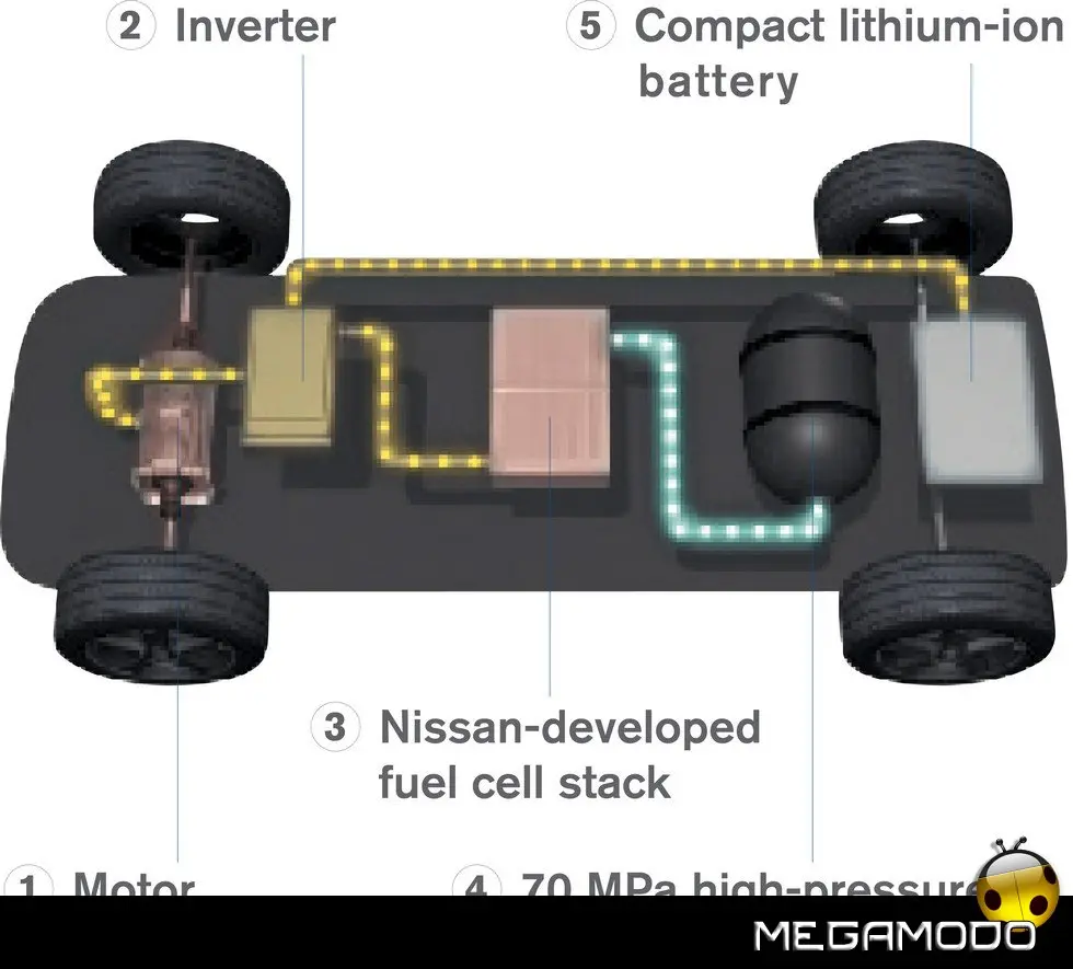 Con un rapporto volume/potenza e peso/potenza di circa il doppio rispetto alla versione del 2003, il pacco di celle a combustibile firmato Nissan sviluppa 90 kW, potenza sufficiente per una velocità massima di 150 km/h.