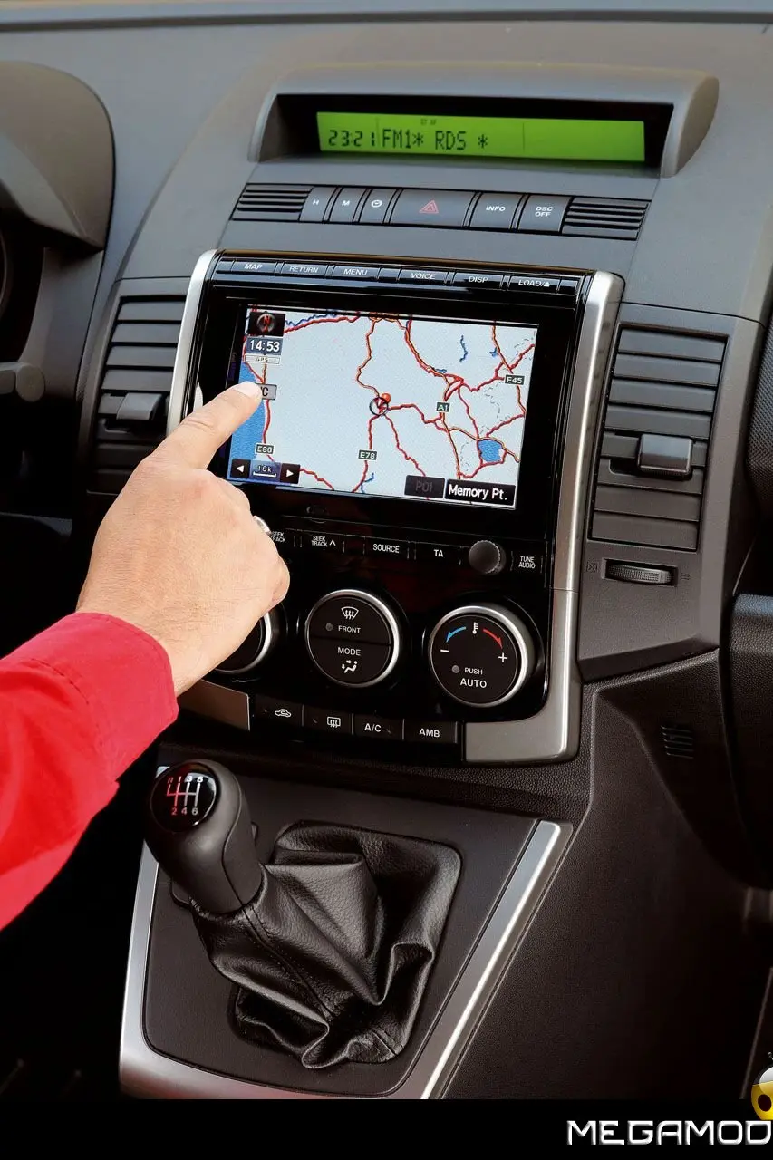 Mazda5 Facelift è anche dotata di un nuovo sistema di navigazione DVD (a seconda della versione e del mercato) concepito in modo da risultare più facile da leggere e da utilizzare, anche grazie al nuovo touch screen multifunzione da 7 pollici che ora è integrato nella consolle centrale ed al comando vocale. Il lettore CD singolo ora è in grado di riprodurre CD in formato MP3, ed è disponibile un lettore a 6 CD integrato nella plancia, così come un sistema Bluetooth® per cellulare con comandi sul volante di guida e comandi vocali (a seconda della versione). Come in precedenza, il sistema di navigazione con DVD include anche una telecamera posteriore , uno strumento davvero utile quando si parcheggia o si fa manovra in spazi molto stretti.