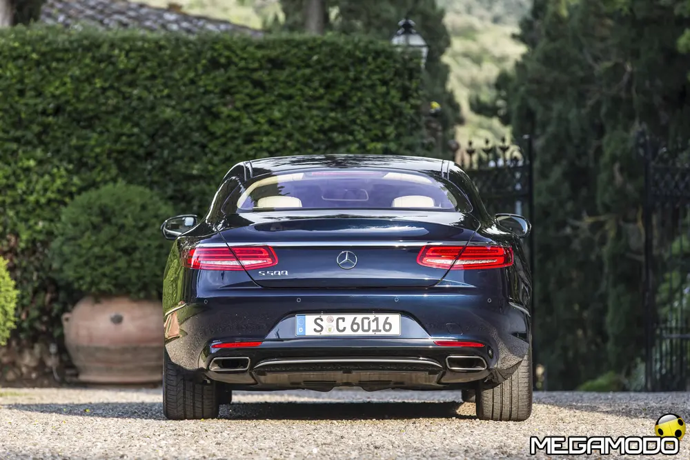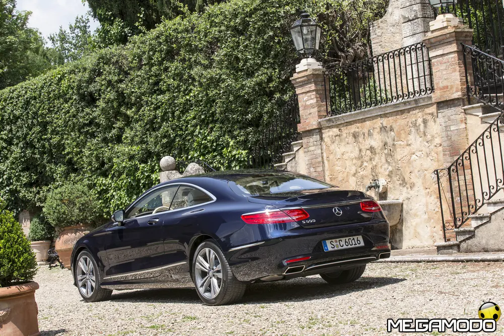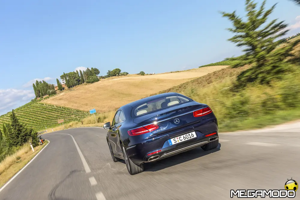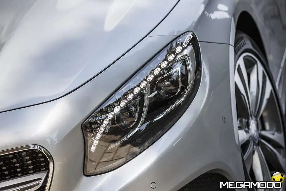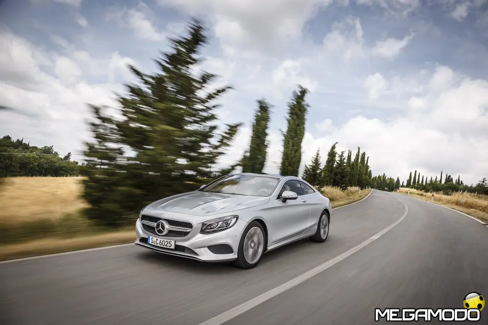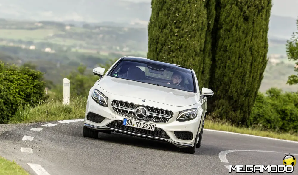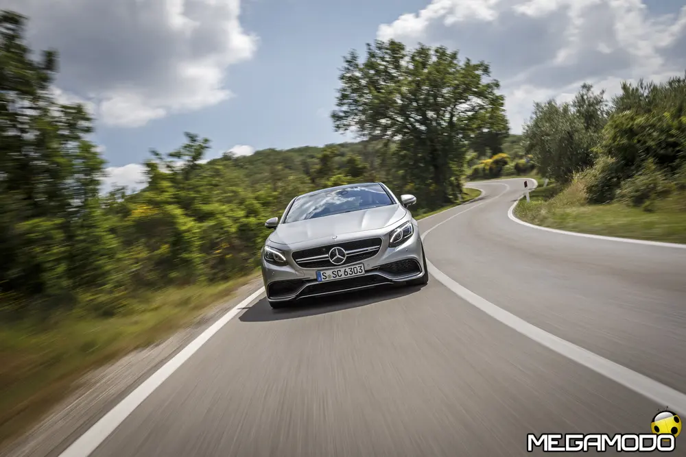 La plancia della Classe S Coupé entusiasma per la sua spettacolare architettura e pone un nuovo parametro di riferimento nel segmento superiore dei coupé. Si articola in un'area superiore ben definita, con un ampio movimento avvolgente che confluisce nelle porte e un corpo inferiore molto ribassato dalle forme flottanti. Questa particolare architettura è resa possibile da una disposizione completamente nuova dell'airbag posto in basso, che consente inoltre di mettere in primo piano, davanti a queste modanature, l'ampio display TFT in due parti nel formato widescreen. Il tutto è sottolineato con stile da luci soffuse. L'alta consolle centrale dall'aspetto sportivo affonda verso il basso, estendendosi fino al vano posteriore. Tutti gli sportelli e gli appoggi presentano un raffinato rivestimento in pelle. Come a bordo di un jet il display head-up, disponibile a richiesta, visualizza le principali informazioni sul parabrezza direttamente nel campo visivo del guidatore, riducendo i motivi di distrazione rispetto a quanto avviene sulla strada. Il sistema fornisce informazioni sulla velocità della vettura e sui limiti di velocità, nonché istruzioni di navigazione e indicazioni fornite dai sistemi di assistenza alla guida. A livello tecnico il dispositivo si basa su un'ottica speculare e su un modulo display a colori con risoluzione di 480 x 240 pixel, che funziona con LED ad alta potenza. Alla guida, tutto questo viene tradotto in sensazioni incredibili, come quelle che la Stella da sempre sa regalare. La Classe S si fa guidare con strema facilità, il volante regala leggerezza e precisione. Il Cambio automatico 7G-Tronic Plus e le sospensioni regalano una guida assolutamente rilassata e, neanche a dirlo, piacevolissima. Con il MAGIC BODY CONTROL, presente a bordo della Classe S, debuttava a livello internazionale il primo assetto in grado di vedere. Ora invece il Coupé presenta un’altra novità mondiale per le auto di serie: la funzione di inclinazione in curva, grazie alla quale la vettura si inclina in curva come se fosse un motociclista o uno sciatore. L'accelerazione trasversale che agisce sulle persone a bordo della vettura viene ridotta come per la guida in una curva ripida e gli occupanti restano più saldi sui sedili. La nuova funzione di inclinazione in curva offre maggior comfort e piacere di guida soprattutto sulle strade extraurbane. Essa mira a ottenere non solo velocità in curva superiori, ma anche un’esperienza di guida piacevole. Parlando di numeri sotto il cofano, non si può che parlare di "artiglieria pesante". Il V8 da 4.663 cm3 della vettura provata, reagisce con una grinta fuori dal comune; grazie al biturbo, e ai suoi 455 CV con 700 Nm di coppia massima la Classe S, se spremuta, reagisce letteralmente come una belva pronta ad attaccare, facendo passare in secondo piano la stazza da circa 2 tonnellate.