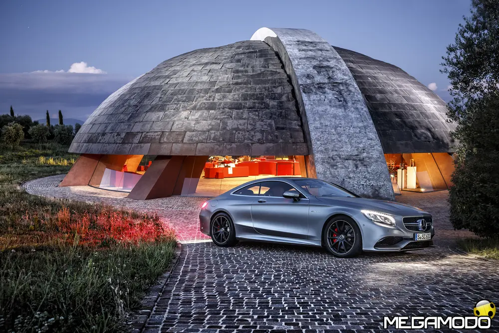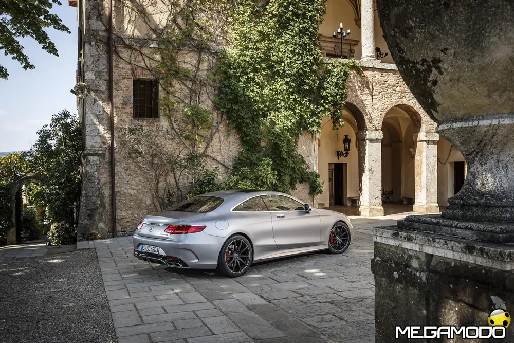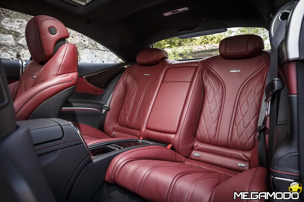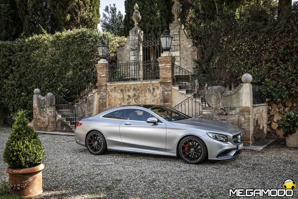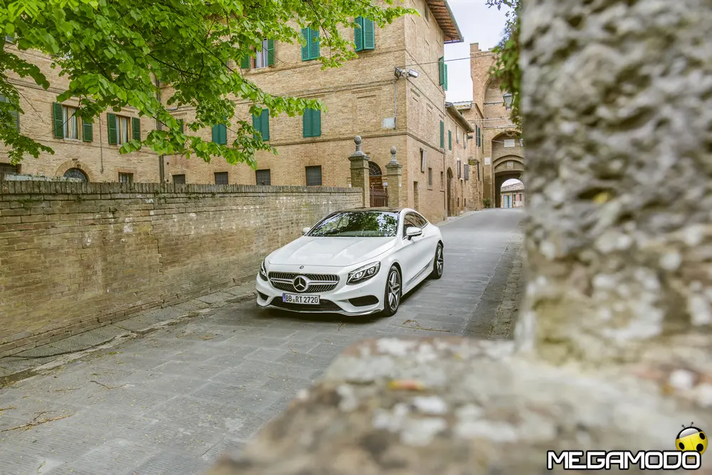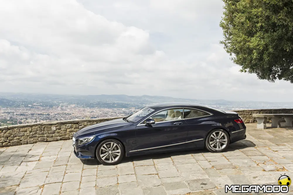 La plancia della Classe S Coupé entusiasma per la sua spettacolare architettura e pone un nuovo parametro di riferimento nel segmento superiore dei coupé. Si articola in un'area superiore ben definita, con un ampio movimento avvolgente che confluisce nelle porte e un corpo inferiore molto ribassato dalle forme flottanti. Questa particolare architettura è resa possibile da una disposizione completamente nuova dell'airbag posto in basso, che consente inoltre di mettere in primo piano, davanti a queste modanature, l'ampio display TFT in due parti nel formato widescreen. Il tutto è sottolineato con stile da luci soffuse. L'alta consolle centrale dall'aspetto sportivo affonda verso il basso, estendendosi fino al vano posteriore. Tutti gli sportelli e gli appoggi presentano un raffinato rivestimento in pelle. Come a bordo di un jet il display head-up, disponibile a richiesta, visualizza le principali informazioni sul parabrezza direttamente nel campo visivo del guidatore, riducendo i motivi di distrazione rispetto a quanto avviene sulla strada. Il sistema fornisce informazioni sulla velocità della vettura e sui limiti di velocità, nonché istruzioni di navigazione e indicazioni fornite dai sistemi di assistenza alla guida. A livello tecnico il dispositivo si basa su un'ottica speculare e su un modulo display a colori con risoluzione di 480 x 240 pixel, che funziona con LED ad alta potenza. Alla guida, tutto questo viene tradotto in sensazioni incredibili, come quelle che la Stella da sempre sa regalare. La Classe S si fa guidare con strema facilità, il volante regala leggerezza e precisione. Il Cambio automatico 7G-Tronic Plus e le sospensioni regalano una guida assolutamente rilassata e, neanche a dirlo, piacevolissima. Con il MAGIC BODY CONTROL, presente a bordo della Classe S, debuttava a livello internazionale il primo assetto in grado di vedere. Ora invece il Coupé presenta un’altra novità mondiale per le auto di serie: la funzione di inclinazione in curva, grazie alla quale la vettura si inclina in curva come se fosse un motociclista o uno sciatore. L'accelerazione trasversale che agisce sulle persone a bordo della vettura viene ridotta come per la guida in una curva ripida e gli occupanti restano più saldi sui sedili. La nuova funzione di inclinazione in curva offre maggior comfort e piacere di guida soprattutto sulle strade extraurbane. Essa mira a ottenere non solo velocità in curva superiori, ma anche un’esperienza di guida piacevole. Parlando di numeri sotto il cofano, non si può che parlare di "artiglieria pesante". Il V8 da 4.663 cm3 della vettura provata, reagisce con una grinta fuori dal comune; grazie al biturbo, e ai suoi 455 CV con 700 Nm di coppia massima la Classe S, se spremuta, reagisce letteralmente come una belva pronta ad attaccare, facendo passare in secondo piano la stazza da circa 2 tonnellate.