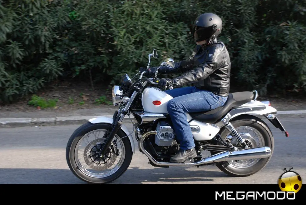 Particolare attenzione è stata dedicata alla geometria dello sterzo, dove il cannotto ha un’inclinazione di 27°50’, un angolo d’incidenza che assicura stabilità e precisione nei cambi di direzione, grazie anche al supporto della forcella Marzocchi, che adotta steli da 40 mm. La sospensione anteriore ha un’escursione di 130 mm ed è combinata con l’azione dei due ammortizzatori posteriori, regolabili nel precarico molla, che si estendono, come per l’avantreno di 130 mm. Il comparto frenante consta di un disco anteriore flottante da 320 mm e uno posteriore da 260 mm. Particolare è anche la sezione delle ruote, con l’anteriore da 18 pollici e il posteriore da 16 per una gommatura a spalla alta, che restituisce al veicolo un’eccellente maneggevolezza e gran sensibilità di guida. MOTORE E TRASMISSIONE Celebre per la sua affidabilità ed economia d’esercizio, il bicilindrico trasversale a V di 90° da 744 cc ha un alesaggio di 80 mm per una corsa di 74, con pistoni dotati di riporto antiusura in grafite e cilindri in lega d’alluminio. Lo small block di Mandello, è alimentato dal sistema d’iniezione elettronica Weber Marelli, con corpi farfallati da 36 mm di diametro, assistito da sonda Lambda che permette al propulsore di rientrare ampiamente nei parametri previsti dall’omologazione Euro 3. Il cambio, dotato di 5 rapporti, è preciso e immediato nella ricerca della folle, con una rapportatura armonizzata all’uso turistico, che esalta la prontezza di risposta. In termini di prestazioni massime, sorprende come a soli 3600 giri/minuto è già disponibile il valore di coppia massima, pari a 54,7 Nm. E se lo scatto non manca, anche la potenza massima, vicina ai 50 CV, è perfettamente in sintonia con il carattere della Nevada , una moto che non deve sfidare il cronometro ma semplicemente divertire. A questo contribuisce, come in ogni Moto Guzzi, il sound baritonale emesso dal bicilindrico Lariano. La sonorità generata dall’inedito doppio scarico della Nevada è, infatti, tra le più gratificanti tra quelle prodotte dal bicilindrico Moto Guzzi.
