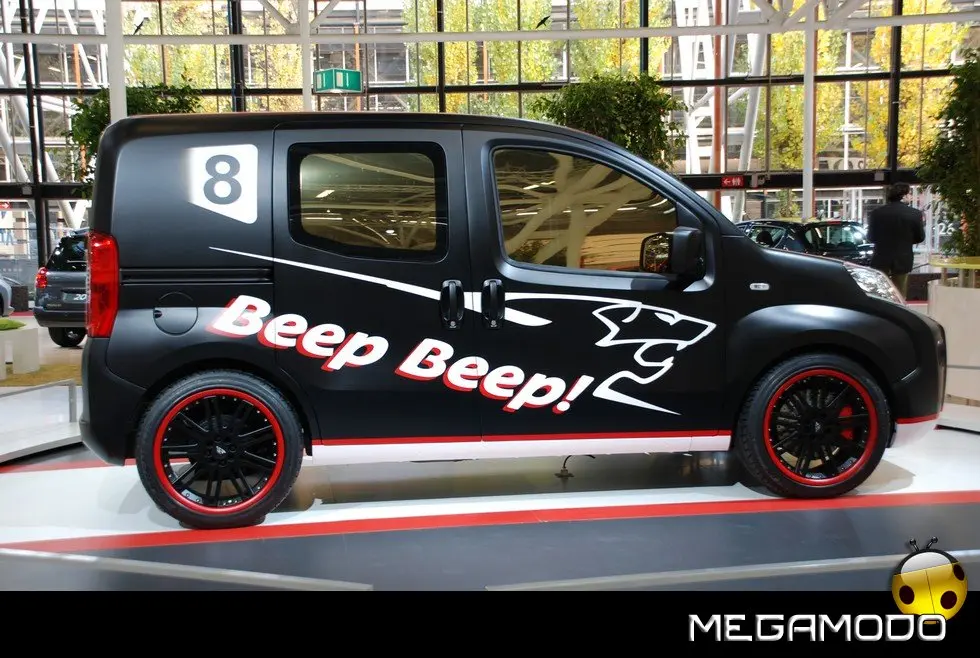 Inoltre, si trovano altri punti in comune tra la 908, vincitrice della LMS, e il “Beep Beep !”… come l’arte di intrufolarsi e di affrontare con disinvoltura il traffico... o ancora il loro motore diesel dotato delle tecnologie HDi FAP®, che ovviamente eroga una potenza diversa, la cui differenza sta in uno zero centrale (più di 700 CV per l’uno e 70 CV per l’altro!). Il Beep Beep ! si identifica quanto più possibile con Peugeot Sport: ha una carrozzeria negli stessi colori della 908, cioè parti laterali nero opaco, cofano e tetto rossi e una striscia bianca che percorre il veicolo in senso longitudinale. Le fiancate riportano la testa del leone stilizzato di Peugeot Sport e, in continuità con i vetri laterali, i numeri 7 e 8 da ogni lato, come le due 908 impegnate nelle gare.