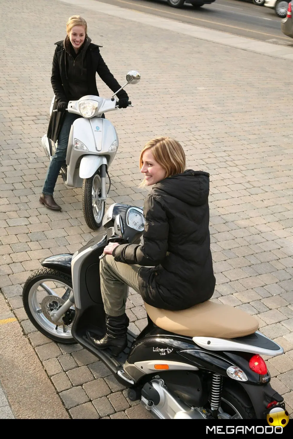 Lo stile Nella vista frontale spicca il faro sul manubrio, gentilmente triangolare a richiamare quello del fortunatissimo e imponente “fratellone” a ruote alte Beverly 500. Lo scudo è altamente protettivo senza però compromettere la fantastica agilità di Liberty nel traffico. Le frecce, con copertura trasparente, sono elegantemente a filo. La mascherina sullo scudo sottolinea la familiarità con la gamma Piaggio mentre tutta la sezione posteriore mantiene la caratteristica snellezza. La plancia strumenti, grande, chiara e leggibile, ben si accorda con l'ampio respiro di tutto il veicolo e comprende tachimetro, contachilometri totale e indicatore del livello carburante. Completano la strumentazione la ricca serie di spie luminose (riserva carburante, faro anabbagliante e abbagliante e indicatori di direzione in funzione) e il pratico orologio digitale con datario. Tutti gli allestimenti sono curati nelle finiture, nelle goffrature ricche, nella scelta accurata dei colori metallizzati. Piccoli interventi distinguono e impreziosiscono le versioni targate: eleganti fregi cromati sottolineano le modanature posteriori e la mascherina sullo scudo, mentre una cornice cromata rende ancora più gradevole la strumentazione. La sella è a 795 mm da terra (805 mm per i targati), così diventa ancora più comodo l'uso del veicolo da parte della vasta clientela femminile. Piloti di tutte le taglie hanno assicurate una perfetta ergonomia, comfort e padronanza del veicolo in ogni condizione di guida.