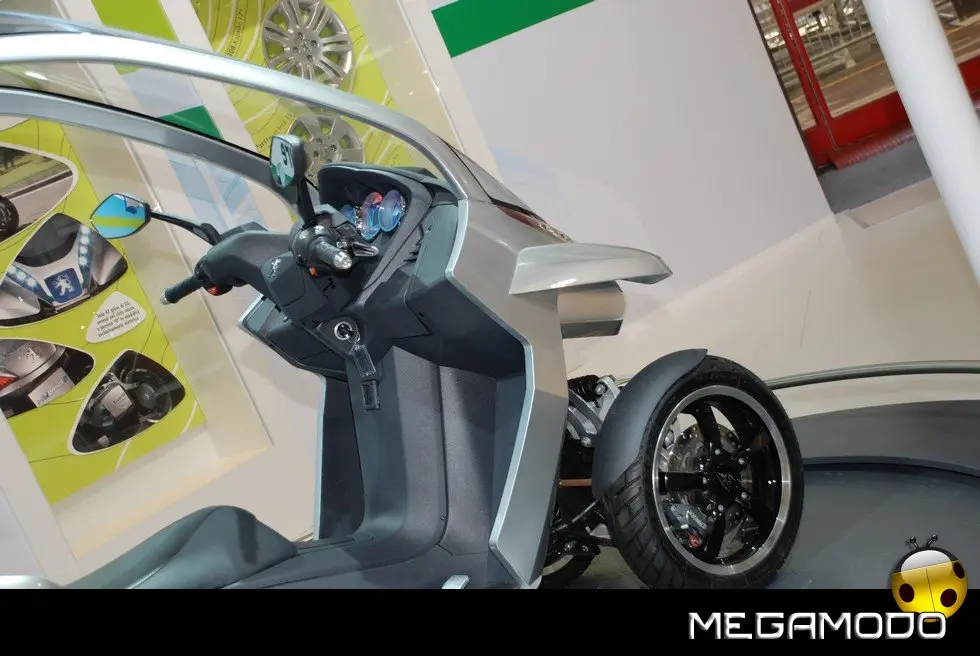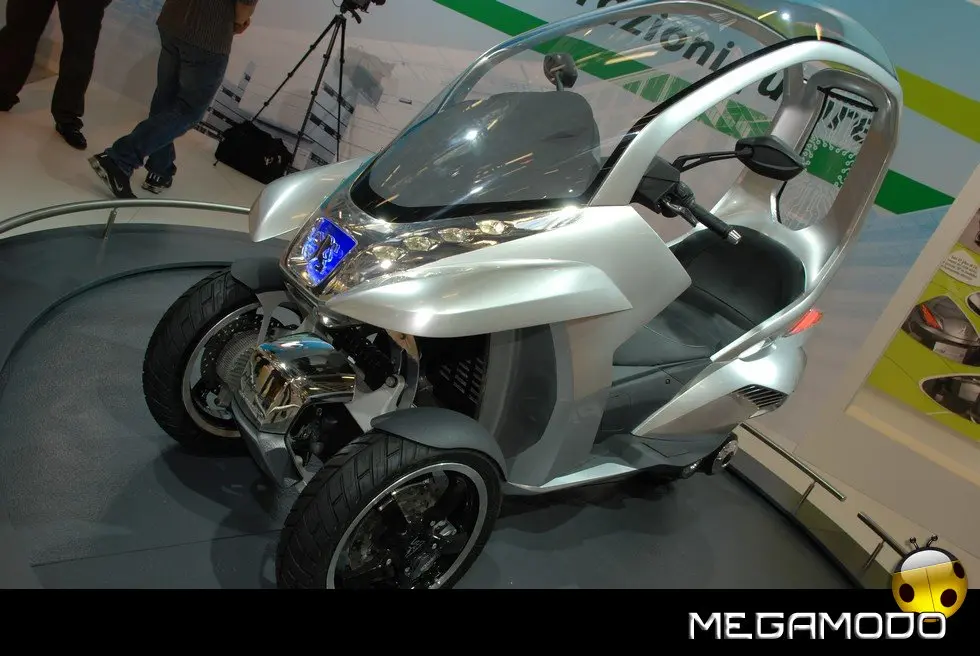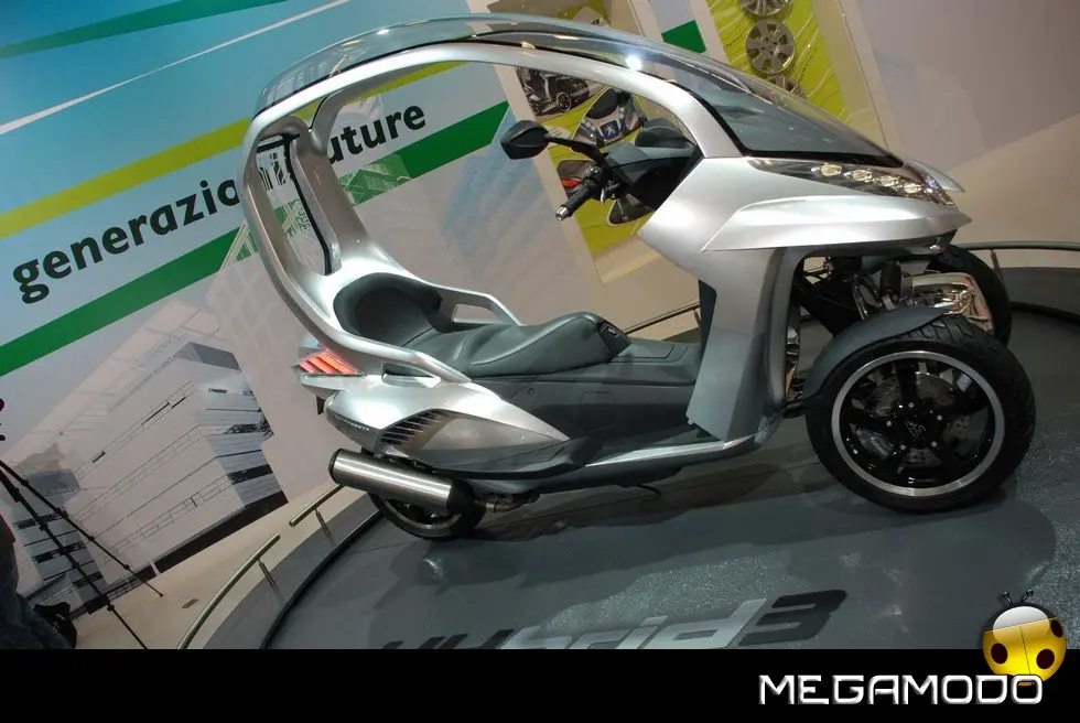 HYbrid3 Compressor è una proposta originalissima per facilitare la mobilità urbana. HYbrid3 Compressor con le sue 3 ruote e la carenatura, costituisce una sorta di anello mancante tra 2 mondi oggi ben distinti: quello dello scooter e quello dell’automobile. Con un motore elettrico in ciascuna delle 2 ruote sull’anteriore, abbinate, nel posteriore, a un motore termico, mette in scena soluzioni tecnologiche ibride molto innovative che permettono a ciascuna ruota di diventare motrice. In un mondo in cui il traffico urbano diventa sempre più intenso, in cui tutti cercano di guadagnare tempo, in cui il prezzo del petrolio è alle stelle e l’ambiente è diventato più che mai una priorità, gli uffici progettazione fanno a gara, mettendo a frutto la loro ingegnosità, per immaginare molteplici soluzioni per il futuro. Esprimendo tutta la loro creatività e il loro know-how, due diverse entità di Peugeot convergono verso un’idea simile e alla fine lavorano in simbiosi per dare vita a un progetto davvero originale: l’HYbrid3 Compressor. Questa “concept car”, o meglio ”concept scooter”, è, infatti, derivato da tutta l’esperienza di Peugeot Motocycles, esperta nel settore degli scooter, e da tutta la creatività e la capacità di innovazione delle equipe di designer e ingegneri di Automobiles Peugeot. Per creare questo prototipo, la casa del Leone ha attinto a piene mani a tutta la ricchezza della sua offerta di mobilità che permette a ogni individuo, a seconda della sua età o dei bisogni del momento, di rivolgersi a gamme di cicli, di motocicli o di automobili del Marchio. L’essenza di questo veicolo sta proprio in quello che rappresenta: una sintesi ideale tra i vantaggi di uno scooter e alcune caratteristiche dell’automobile. L’architettura di questo prototipo si compone, dunque, di 3 ruote, ai fini della massima stabilità, sicurezza e piacere di guida. La sua larghezza di 82 cm gli permette di inserirsi nel traffico urbano mantenendo l’efficacia di un veicolo a 2 ruote. Il parabrezza si prolunga fino al posteriore per formare una cellula di protezione contro le intemperie, molto efficace per il pilota e il suo passeggero. Infine, il veicolo integra la tecnologia HYbrid che integra qui il motore termico benzina Compressor che equipaggia già lo scooter Satelis. Ha una potenza di 15 kW (20 CV) che muove la ruota posteriore ed è abbinato a due motori elettrici da 3 kW ciascuno, situati nelle ruote anteriori. L’insieme sviluppa una potenza massima cumulata di 21 kW (29 CV) a fronte di consumi di carburante particolarmente contenuti, con 2,0 l/100 km pari a 47 g/km di CO2 nel ciclo misto e persino “0” nel modo soltanto elettrico. Questa configurazione meccanica permette anche all’HYbrid3 Compressor di beneficiare di 3 ruote motrici, a vantaggio della sicurezza e del piacere di guida. Grazie alla sua estrema ibridazione, il concetto HYbrid3 Compressor crea un nuovo punto di riferimento in termini di sicurezza (migliore motricità e migliore frenata), di praticità e di ecologia, per una polivalenza inedita, in osmosi con il suo ambiente.