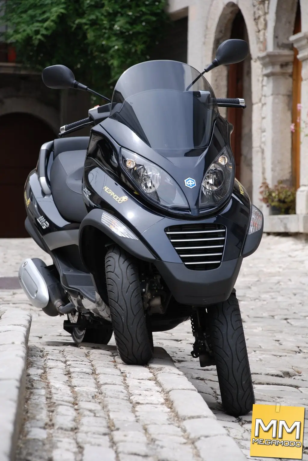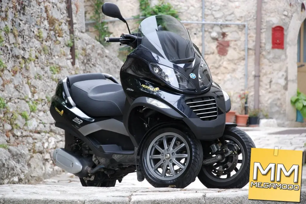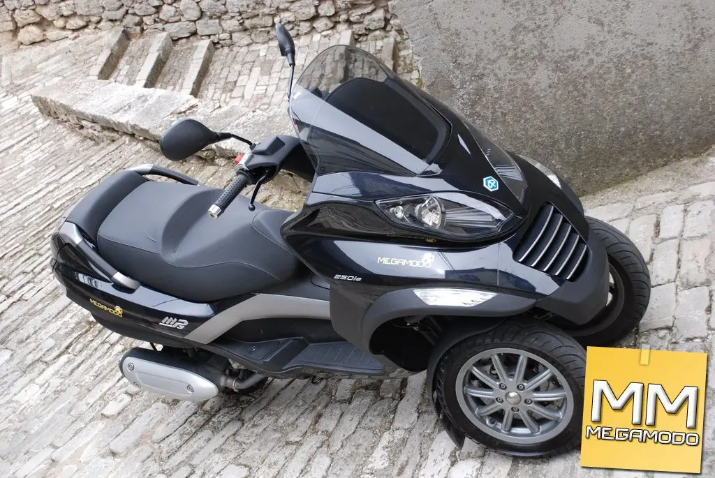 essant’anni dopo la nascita della Vespa, la Piaggio è tornata sul mercato con una nuova rivoluzione, questa volta però a tre ruote: MP3. Due ruote davanti e una dietro per garantire maneggevolezza e sicurezza su qualsiasi tipo di terreno, ridefinendo il concetto stesso di stabilità dinamica. L’avantreno, con le due ruote indipendenti e basculanti, consente una stabilità superiore a qualsiasi scooter; la rivoluzione delle tre ruote si avverte in tutta la sua importanza nelle condizioni critiche per i mezzi tradizionali. Nei percorsi cittadini e metropolitani l’MP3 non ha paragoni in fatto di sicurezza: è possibile incrociare i binari dei tram, molto diffusi nelle nostre città, senza problemi, frenare sulla ghiaia o sul terriccio con la stessa sicurezza di un fondo asfaltato, curvare in presenza di tratti umidi o di pozze d’acqua senza che sia compromessa la traiettoria. Ad agio nell’ambiente urbano è anche facilissimo da parcheggiare, grazie al sistema elettro-idraulico di bloccaggio della sospensione (optional), che permette al veicolo di autosostenersi anche senza il classico cavalletto centrale comunque in dotazione. Azionando il pulsante posto sul manubrio il sistema entra in funzione e blocca il rollio del veicolo, consentendo così al pilota di parcheggiare senza dover utilizzare il cavalletto. Il blocco del rollio è ottenuto mediante un elettroattuatore che aziona, tramite trasmissione meccanica, la pinza centrale di blocco-rollio e manda in pressione un circuito idraulico che agisce sulle pinze di blocco ammortizzatori. La centralina di controllo consente l’attivazione dell’elettroattuatore, dopo che il pilota ha azionato il pulsante, solo nel caso in cui la velocità del veicolo sia compresa tra 23 km/h e 10 km/h, a seconda della decelerazione rilevata (maggiore è la decelerazione, maggiore è la velocità consentita). Inoltre la valvola a farfalla deve essere chiusa ed il regime di rotazione del motore inferiore a 3.000 giri/min. A garanzia della sicurezza del guidatore, il dispositivo di blocco-rollio si disinserisce premendo il comando al manubrio, oppure si disattiva automaticamente quando la velocità del veicolo supera i 15 km/h, o se la valvola a farfalla non è completamente chiusa, o ancora a un regime di rotazione del motore superiore a 3.000 giri/min. Una comoda leva, posta nel retroscudo anteriore, aziona il freno di stazionamento, che rende sicura la sosta senza cavalletto anche su piani inclinati. Il sistema consente inoltre di parcheggiare le due ruote anteriori su dislivelli fino a 20 cm, praticamente potete parcheggiarlo ovunque. Gli spazi di frenata sono straordinari: grazie al sistema frenante a tre dischi da 240mm con pinze a doppio pistoncino da 30mm, lo spazio di arresto è ridotto, rispetto ad uno scooter tradizionale, del 20% in condizioni normali, e addirittura del 24% in condizioni di bassa aderenza. La dotazione ciclistica è il cuore dell'MP3: il telaio in tubi di acciaio altoresistenziale, è frutto di un progetto che si avvale delle migliori tecnologie CAD e della FEM (Finite Element Method) analysis computerizzata. Elementi come la resistenza strutturale e il peso sono stati perfettamente definiti e testati già dalle fasi iniziali del progetto, verificando, in ogni tratto progettuale, la validità delle soluzioni adottate. Al telaio è ancorata, mai vista nel mondo scooter, l’innovativa sospensione a quadrilatero articolato, un progetto originale Piaggio, il cui meccanismo di rollio è composto da quattro bracci fusi in alluminio, articolati su altrettante cerniere solidali al cannotto centrale, e da due cannotti laterali collegati ai suddetti bracci mediante perni e cuscinetti a sfere. All’interno dei cannotti laterali ruotano il tubo sterzo destro e quello sinistro, in un classico schema monobraccio. L’MP3 monta 3 ruote da 12”, gommate con pneumatici Pirelli (nella versione da noi testata) da 120/70 all’anteriore e 130/70 al posteriore, che lavorando insieme alla rivoluzionaria sospensione anteriore consentono angoli di piega fino a 40°. La dotazione ciclistica è completata, al posteriore, da una sospensione monobraccio con due ammortizzatori idraulici a doppio effetto, con molla elicoidale e precarico regolabile su 4 posizioni. Sicuramente la seconda regolazione è quella migliore, soprattutto nella guida sportiva. Mettere l'MP3 in crisi è impresa ardua. Solo frenando con il mezzo molto inclinato l’avantreno tende a chiudere ma è davvero una situazione limite. Piuttosto abbiamo avvertito qualche problema al posteriore visto che trovare il limite è molto semplice, dato che che ci vuol poco per iniziare a strusciare il cavalletto in piega. Vi potrà capitare di sentire la ruota posteriore derapare (soprattutto sui fondi difficili), ma non preoccupati non si cade anzi per i più pratici diventa perfino divertente. L’MP3 si distingue subito per l’estetica innovativa e accattivante, l’ingombro della carreggiata anteriore è di soli 420 mm; caratteristica che lo rende omologabile come un tradizionale motociclo a due ruote. L’estetica dell’avantreno, è caratterizzata da linee filanti e da superfici che, per trattamento, si avvicinano a quelle del settore automobilistico: i gruppi ottici anteriori e il cupolino si fondono a formare, un volume unico che, oltre a slanciare il veicolo, costituisce l’elemento di protezione per il pilota. Le parti laterali dello scudo sono caratterizzate dai parafanghi di materiale antiurto, che svolgono una funzione protettiva sia per il pilota che per il veicolo, mentre il posteriore è stato pensato per massimizzare comfort e capacità di carico. Lo sportello posteriore, in tinta con la carrozzeria, completa la silhouette del veicolo e permette di accedere direttamente al vano sottosella. Con ben 65 litri di capacità e il doppio accesso al vano, dal portellone e dalla sella, la funzionalità dell’MP3 è la migliore della categoria. Il vano bagagli può infatti conten