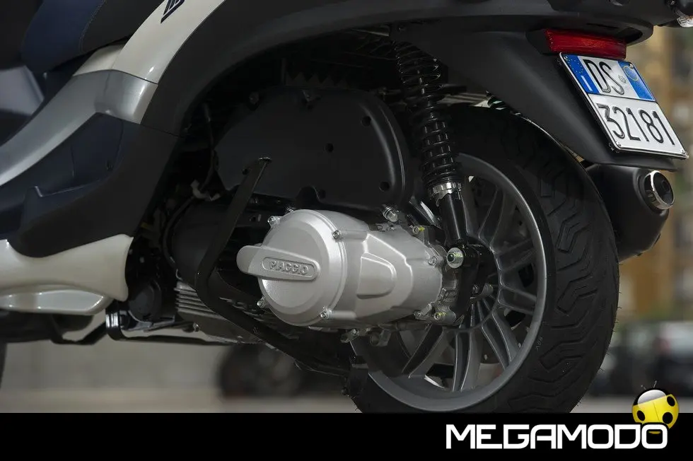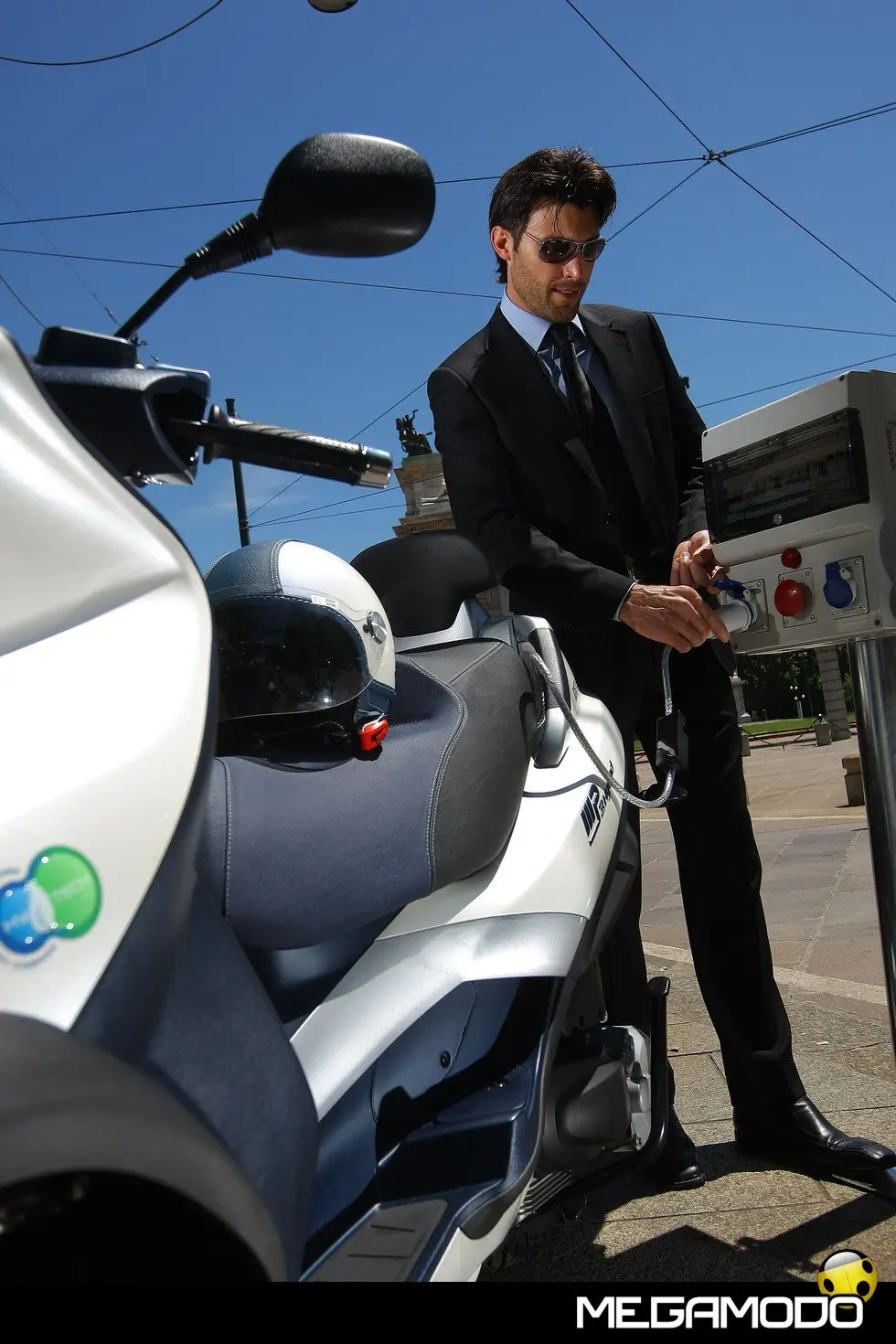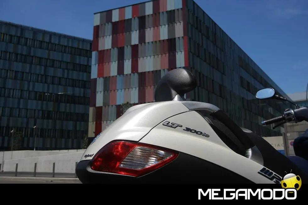 SCHEDA TECNICA: Cilindrata motore termico: 278 cc (alesaggio x corsa - 75 x 63 mm) Ciclo termodinamico: otto 4-tempi Distribuzione: singolo albero a camme in testa, quattro valvole Raffreddamento: a liquido Sistema di accensione: elettronica digitale a scarica induttiva Potenza motore ibrido: 18,2 kW (25 CV) a 7.500 rpm Coppia motore ibrido: 27,5 Nm (2.8 kgm) a 3.500 rpm Macchina elettrica: sincrona brushless a magneti permanenti Tensione di alimentazione: trifase a corrente alternata Controllo macchina elettrica: inverter a controllo digitale Raffred. macchina elettr.: ad aria Potenza macchina elettrica: 2.6 kW (3.5 CV) Coppia macchina elettrica: 15 Nm Modalità operative: 4 modalità: 2 di tipo Ibrido, 2 di tipo Elettrico (retr. compresa) Modalità di ricarica batterie: in movimento, in frenata e decelerazione, dalla rete elettrica (carica batterie integrato nell’elettronica di controllo) Batteria di trazione: agli ioni di litio Trasmissione: variatore automatico CVT con asservitore di coppia Sistema di controllo motore: di tipo Ride-by-Wire con sistema iniezione ad anello chiuso (closed-loop) Trattamento gas di scarico: marmitta catalitica Telaio: doppia culla in tubi di acciaio altoresistenziale Sospensione anteriore: a quadrilatero articolato composta da quattro bracci in alluminio che sostengono due tubi sterzo, cinematismo della sospensione a bielletta tirata con asse ruota a sbalzo Sospensione posteriore: due ammortizzatori idraulici a doppio effetto e precarico molla regolabile Freno anteriore: due dischi in acciaio inox Ø 240 mm e pinza flottante a doppio pistoncino Ø 30 mm Freno posteriore: disco in acciaio inox Ø 240 mm e pinza a pistoncini contrapposti Ø 30 mm Cerchio ruota anteriore: lega allumino pressofusa 12" x 3,00 Cerchio ruota posteriore: lega alluminio pressofusa 14" x 3,75 Pneumatico anteriore: tubeless 120/70-12” Pneumatico posteriore: tubeless 140/60-14” Lunghezza/Larghezza: 2.140 mm/760 mm Passo: 1.490 mm Altezza sella: 780 mm Carreggiata modello LT: 465 mm Capacità serbatoio: 12 litri (di cui 1,8 riserva) Peso a secco: 257 kg Consumo (ciclo 2/3 ibrido - 1/3 elettrico) 50 Km/l Emissioni CO2 (ciclo 2/3 ibrido - 1/3 elettrico) 46 g/Km Omologazione: Euro2