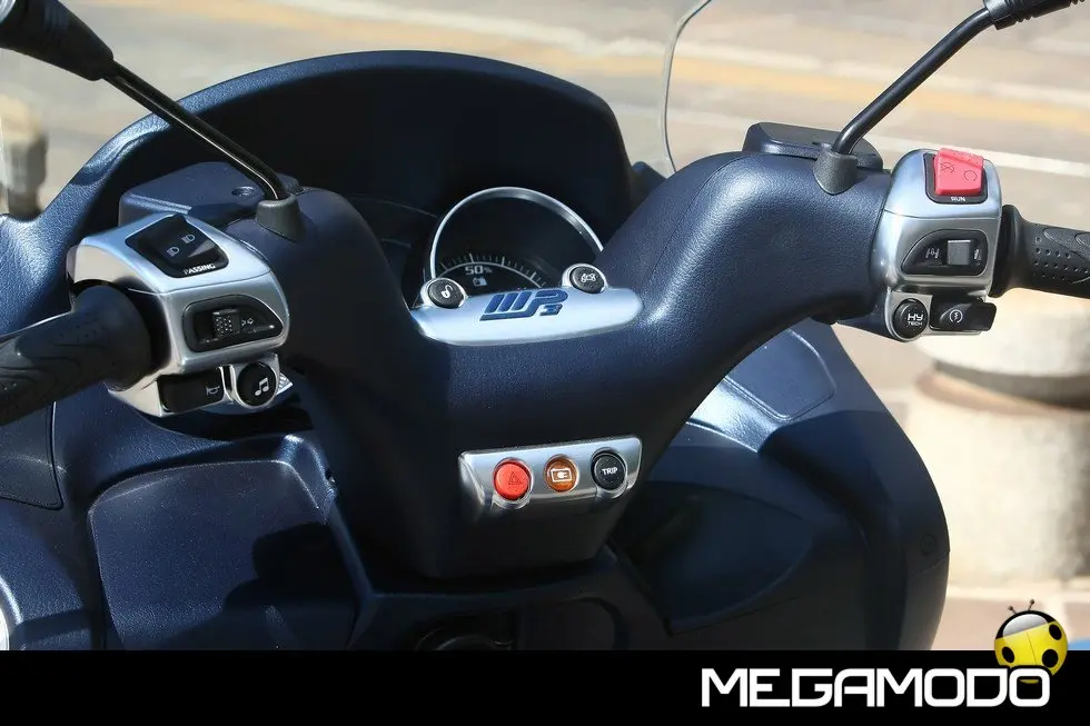 Estetica esclusiva e la praticità di sempre Dal punto di vista estetico Piaggio Mp3 Hybrid LT 300ie si distingue dalla versione tradizionale per le eleganti finiture. L’esclusiva colorazione bianco perla è abbinata ad una raffinata sella bicolore, comoda per pilota e passeggero, che riprende la verniciatura delle plastiche del controscudo. La strumentazione accoglie l’indicatore di carica della batteria mentre una plancia centrale ospita l’hazard, il pulsante del computer di bordo e la spia che segnala il collegamento alla rete elettrica per la ricarica delle batterie. Tra i comandi compaiono due nuovi pulsanti: sulla sinistra il segnale acustico indispensabile per comunicare la propria presenza quando si circola silenziosi in modalità elettrica nelle aree a traffico limitato, mentre sulla destra è presente il pulsante “Hy Tech” con il quale il pilota seleziona le quattro modalità di funzionamento.