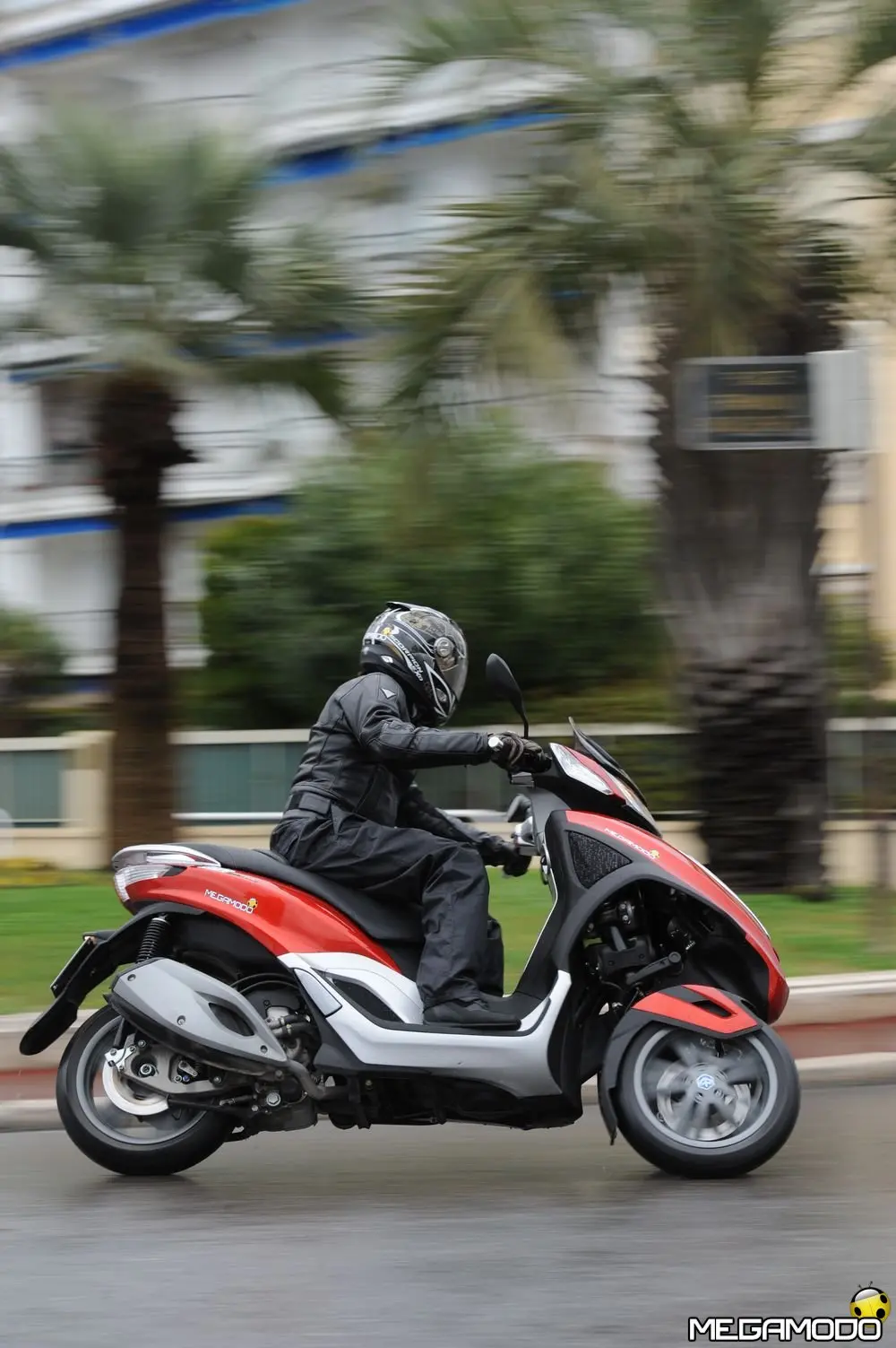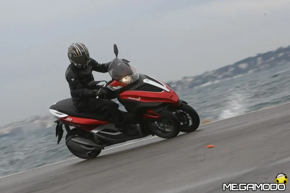 Nella guida l’avantreno risulta più preciso, il miglioramento è tangibile fin dai primi metri: quasi ci si dimentica di avere due ruote anteriori e viene naturale guidarlo come un normale scooter. Il sistema di sospensione anteriore a quadrilatero articolato e la doppia ruota anteriore sono elementi unici e distintivi che rendono la guida di Piaggio Mp3 un’esperienza assolutamente rivoluzionaria, che consente di sperimentare una stabilità in curva superiore a qualsiasi scooter, beneficiando di una tenuta di strada eccellente che si avverte in tutta la sua importanza sull’asfalto bagnato o in condizioni di scarsa aderenza.
