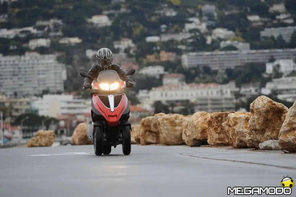 La posizione di guida è decisamente ottimale: la pedana all’apparenza più compatta risulta addirittura più ospitale. Inoltre, essendo sistemata più in basso (20 mm meno rispetto ad Mp3 standard), offre più spazio alle gambe del pilota mentre per il passeggero sono state predisposte due pedane estraibili che ripiegate si integrano perfettamente nella carena.