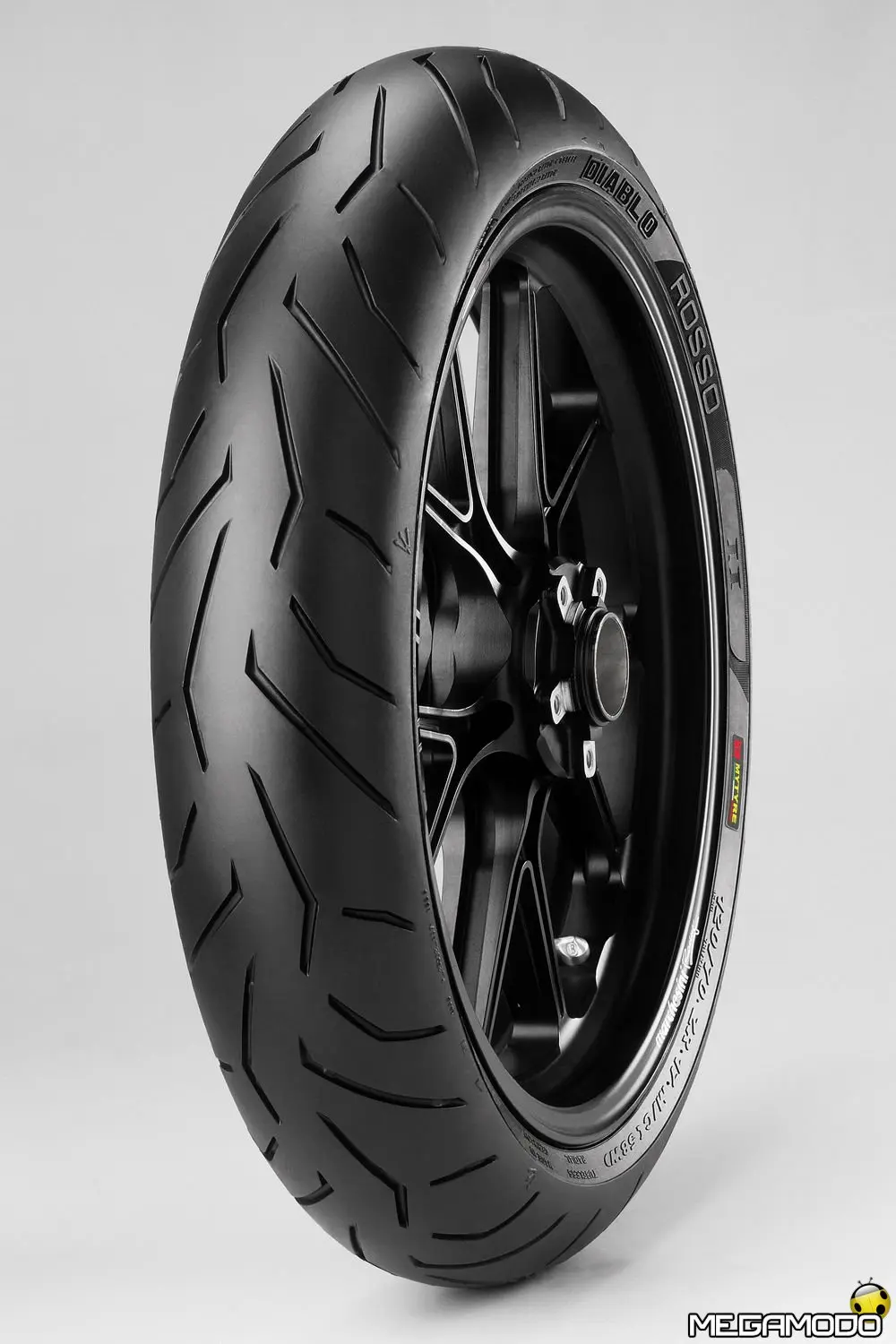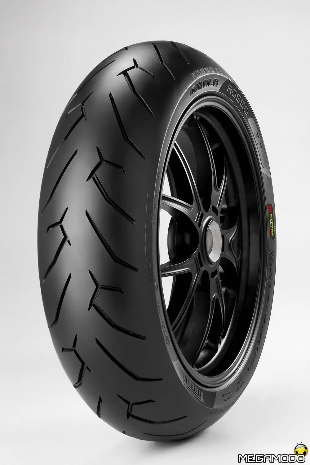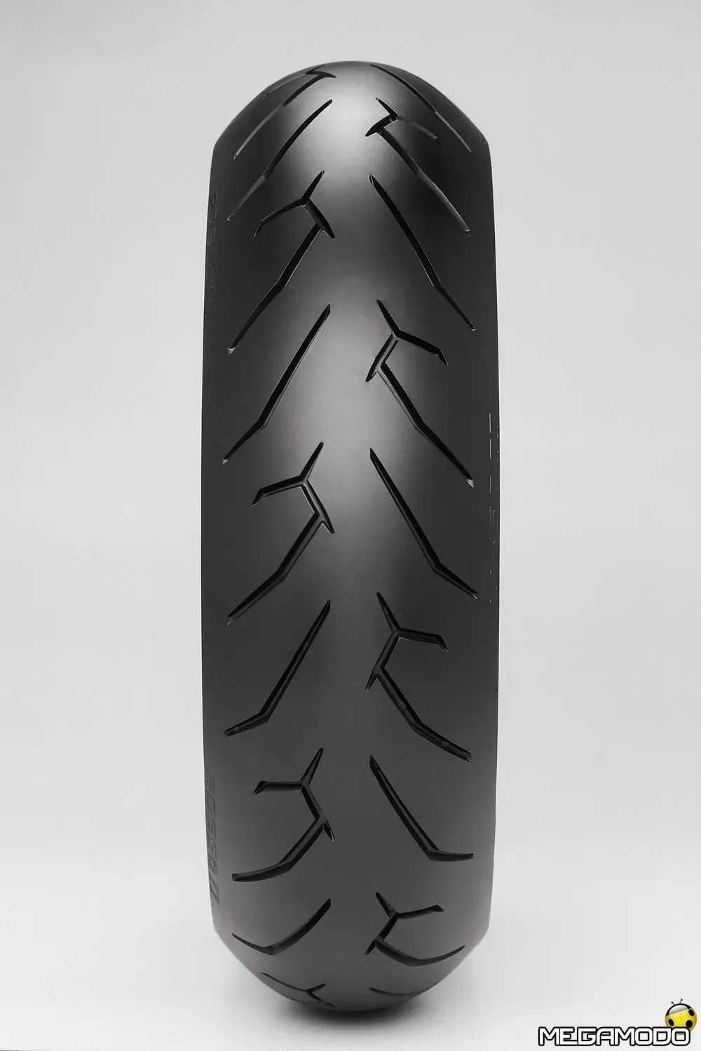 Al posteriore il pneumatico è ora bi-mescola con inoltre la “spalla nuda” che caratterizzava il Diablo Rosso. Il disegno, stradale ma accattivante, è stato pensato con l’obiettivo di massimizzare il drenaggio ma anche la stabilità sul dritto senza rinunciare a chilometraggio. Il disegno battistrada inoltre, per il pneumatico posteriore, assolve anche la funzione di armonizzare la temperatura tra le due diverse mescole.