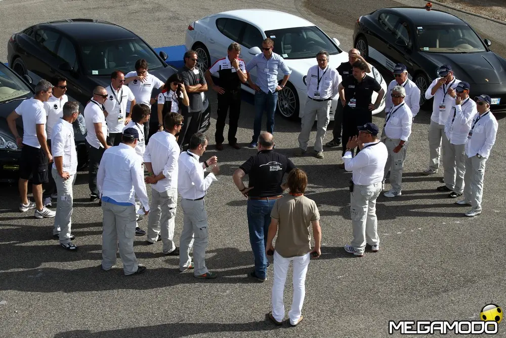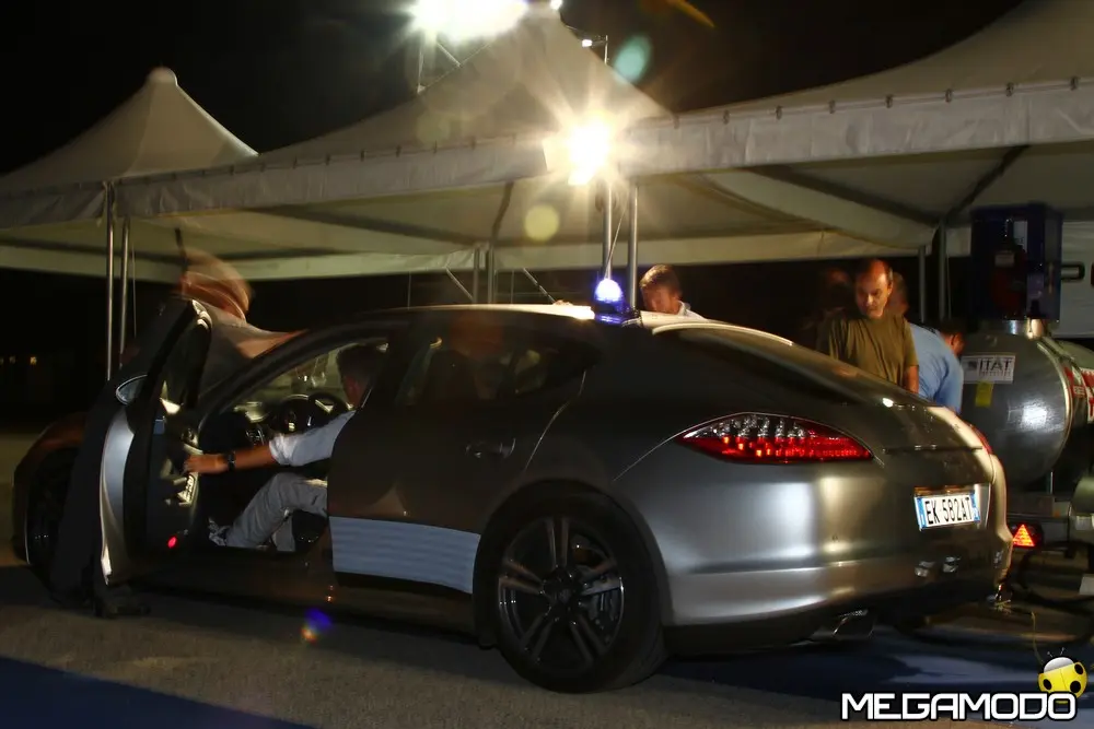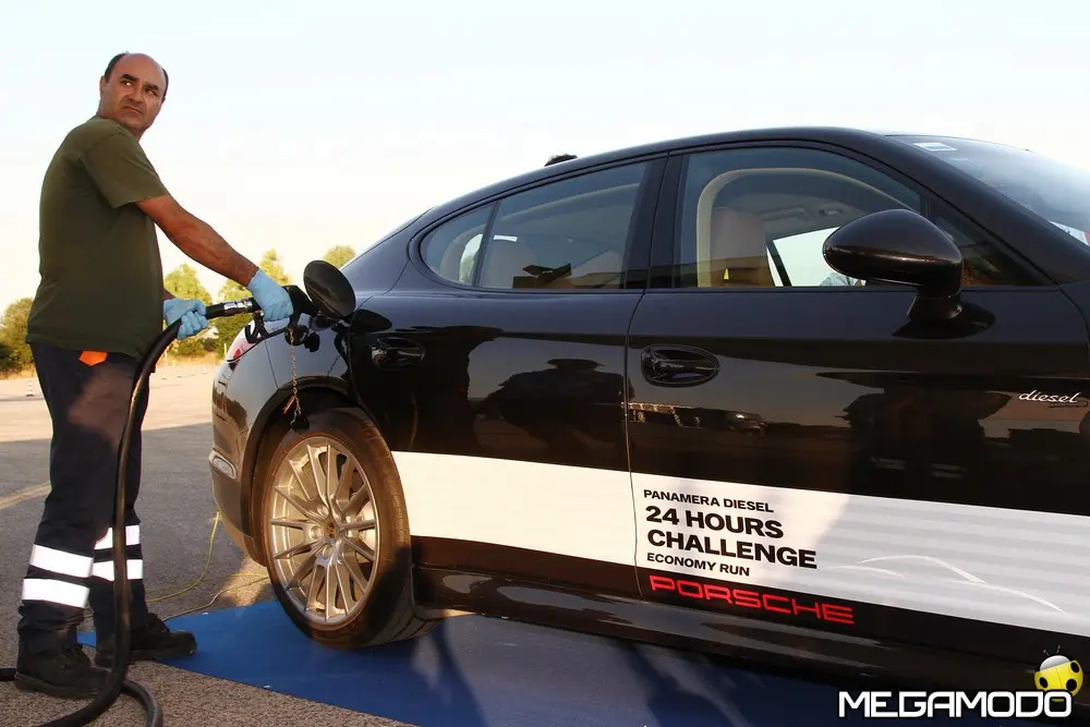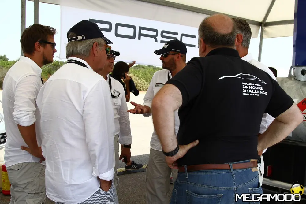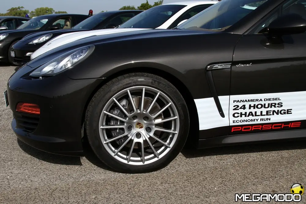 L'arrivo alle 9.11 con le tre Panamera Diesel in parata. Tutti insieme appassionatamente dopo una 24 Ore ricca di fatti e colpi di scena che hanno reso elettrizzante la prima edizione della “Panamera Diesel, 24 Hours Challenge, Economy Run”. L'anello di velocità della pista prove del Technical Center di Nardò è stato lo scenario dove due Panamera condotte da 12 giornalisti divisi in due equipaggi si sono sfidate a confronto con la vettura dei piloti professionisti della Porsche Sport Driving School. L'obiettivo grazie ad un'appassionante 24 Ore era quello di portare l'attenzione sulle doti di stradista grazie a comfort e consumi ridotti della Porsche Panamera Diesel ad un anno di distanza dal suo lancio commerciale. La chiave vincente è stata privilegiare l'efficienza della Panamera Diesel: chi ha inseguito solo il risparmio di carburante, con un picco assoluto che ha raggiunto i 18,9 km/l ha dovuto soccombere a chi, invece, ha abbinato anche la ricerca della percorrenza più alta. Insomma, non era necessario andare piano, ma anzi era possibile trarre il massimo risparmio dalla vettura viaggiando proprio alle velocità limite del codice della strada. Le tre Panamera hanno coperto un totale di 7.967 km ad una velocità media di circa 120 km/h con un consumo di 6,1 litri per 100 km, in linea con i valori dichiarati dalla Casa (6,8 litri per 100 km NCPE). La distanza poteva essere maggiore se le forature sui panettoni che delimitano l'anello non avessero resa necessaria la neutralizzazione della prova per due ore per motivi di sicurezza. Marco Scafati (La Repubblica), team leader della squadra B composta anche da Luca Contartese (Virgiliomotori), Roberto Sposini (Gente Motori), Mario Cornicchia (Motorbox.com), Lodovico Basalù (Auto) e Alessio Odinzoff (Canale Italia) nella 24 Ore ha coperto una distanza di 2.714 km e ha raggiunto un fattore K di 1819, frutto della velocità media di 120,73 km/h per un consumo medio di 15,06 km/l. L'equipaggio della vettura B, seguendo l'esempio dei piloti professionisti, ha capito che non si dovevano penalizzare le prestazioni sull'altare del risparmio energetico.