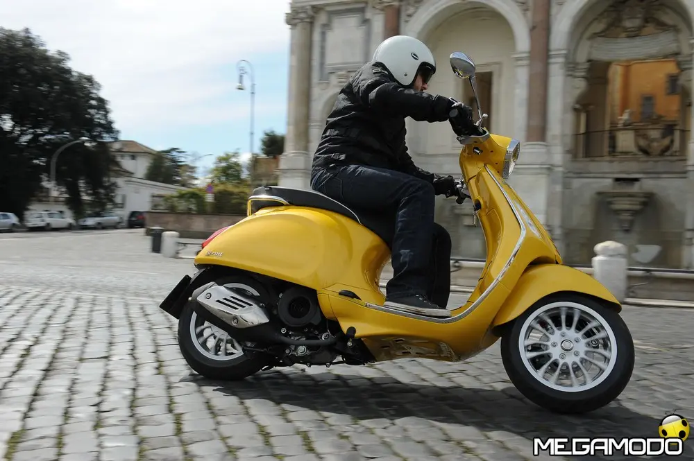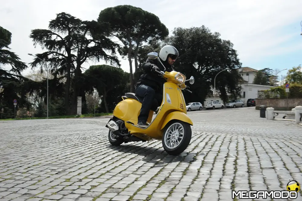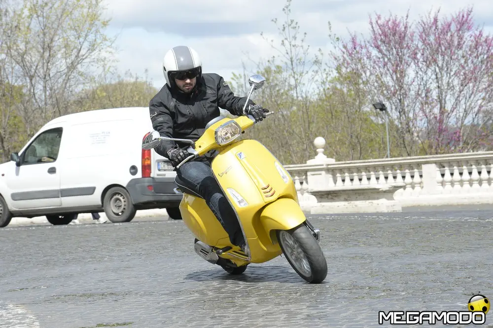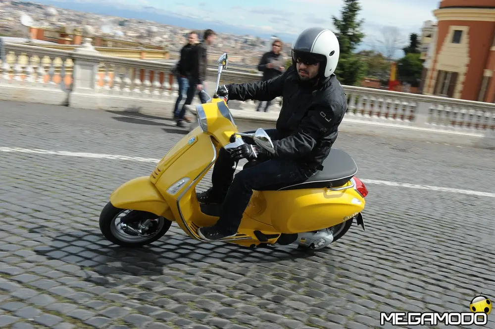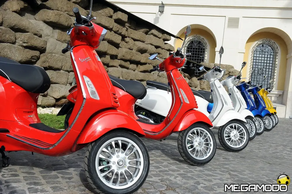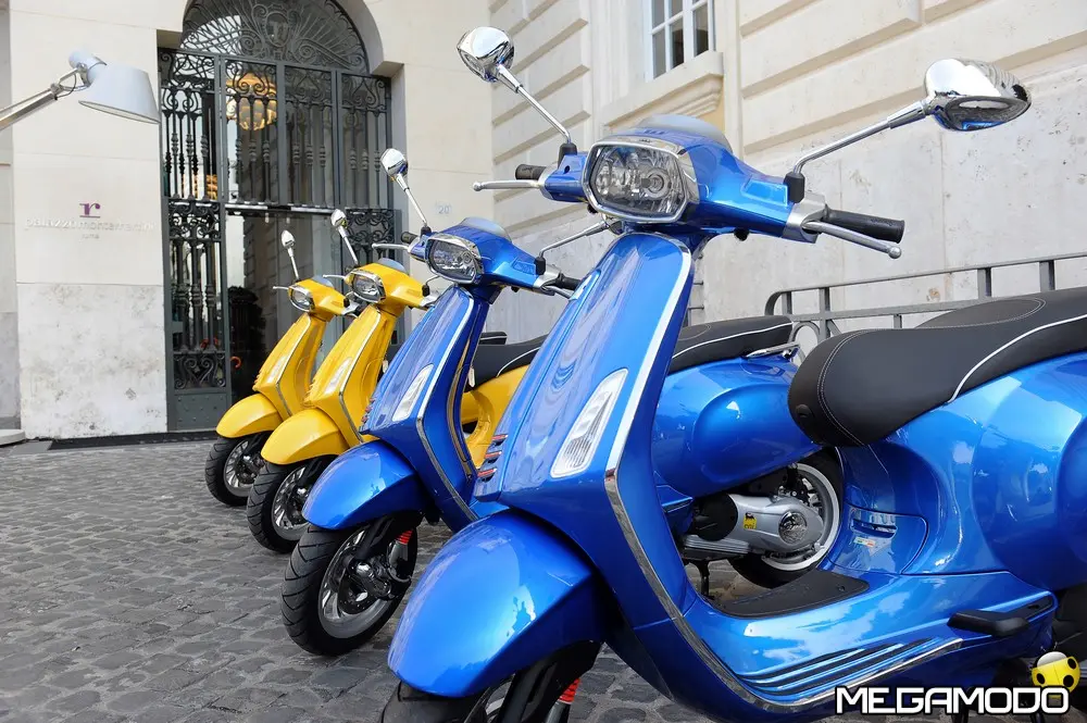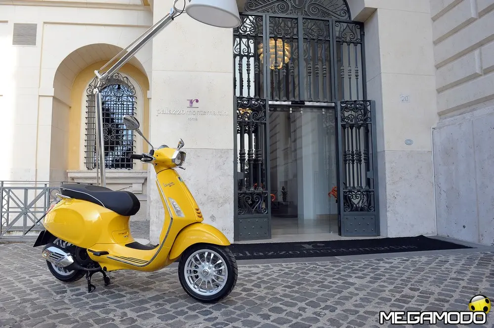 Il risultato è una grafica nuova, sportiva, un manubrio che torna ad avere una divisione orizzontale come le Vespe vintage, e poi abbiamo voluto lavorare sui bracciali dove sono inseriti i comandi elettrici, questi ricordano il vecchio cambio comando frizione delle vespe degli anni ’60. I dettagli diventano sportivi come la cravattina sullo scudo frantale così come la molla della sospensione anteriore, nuove maniglie passeggero, più adatte alla posizione di quest’ultimo, nuovo vano di carico più ampio che ospita un casco jet con visiera. L’ergonomia è stata aumentata, c’è molto più spazio tra sella e contro-scudo, quindi il pilota ha più spazio per gambe e piedi. Nel posteriore troviamo luci a LED per lo stop e la luce di posizione che disegna una V, gli indicatori di direzione a filo carrozzeria molto piccoli. Per quanto riguarda la gamma colori abbiamo: bianco, nero, rosso, blu e giallo. Inoltre abbiamo la sella monoposto, i cerchi bicolore e la cravatta sullo scudo è stata colorata come la 50 Special. Non potevano mancare il parabrezza alto, il bauletto, la pedana, il supporto smartphone, degli elementi cromati di protezione. Abbiamo sviluppato anche delle borse in cuoio e poi c’è una coperta impermeabile che si può attaccare al retro della Vespa per fare un pic-nic. Vespa ha anche una linea di caschi che riprendono i colori del veicolo. Ma Vespa è anche un mondo lifestyle e comprende, quindi, anche una linea di abbigliamento.”