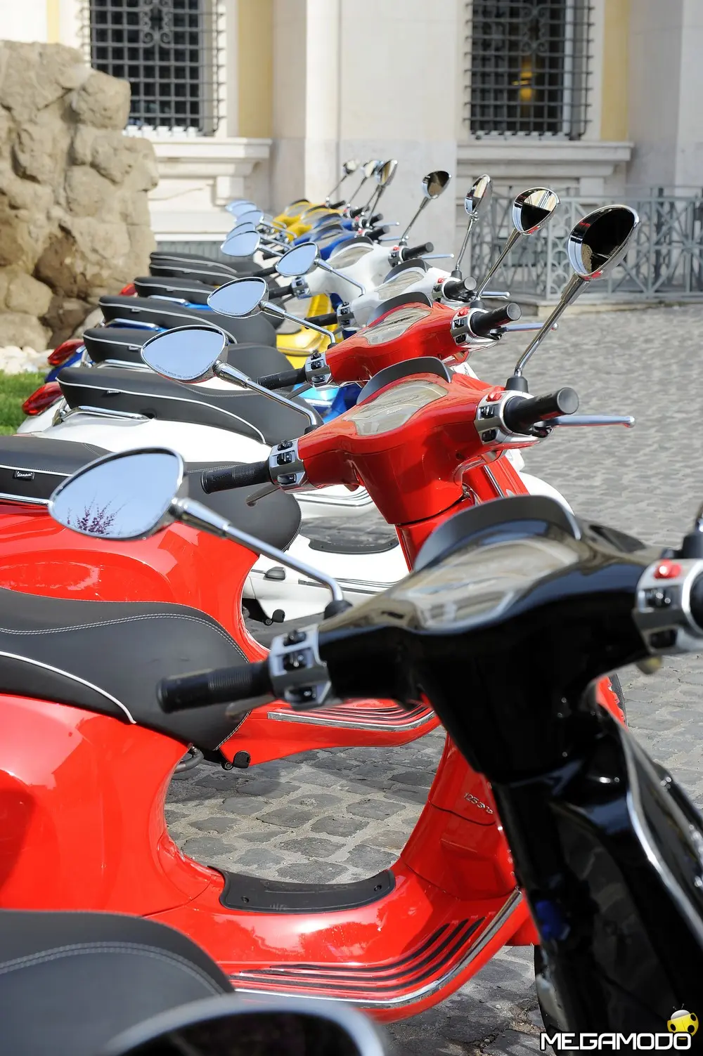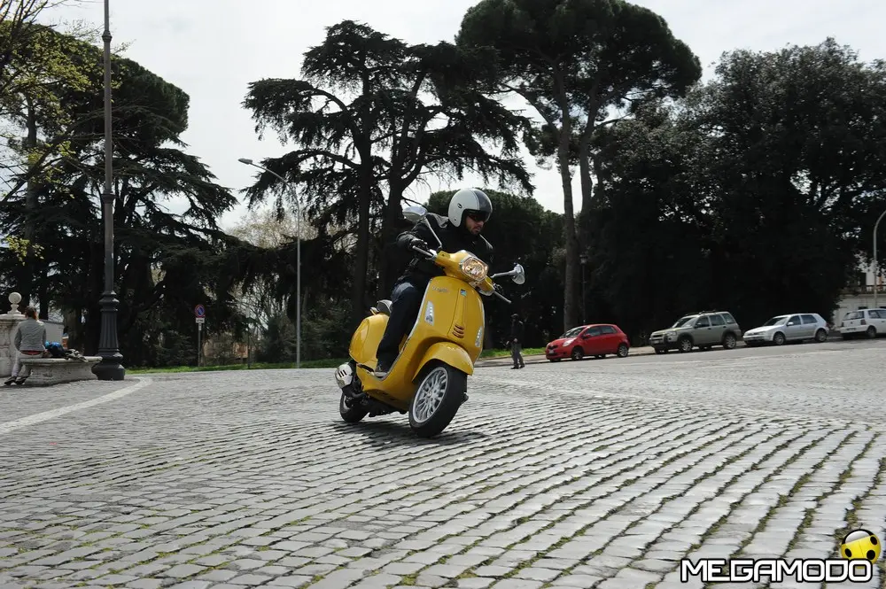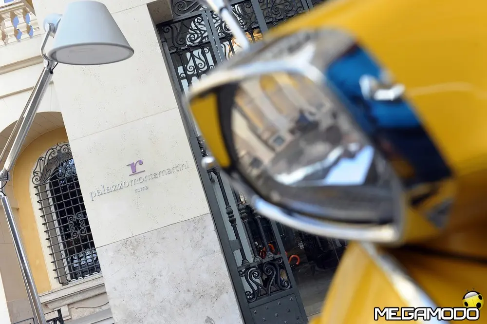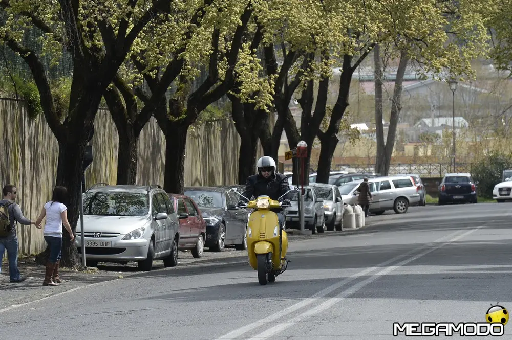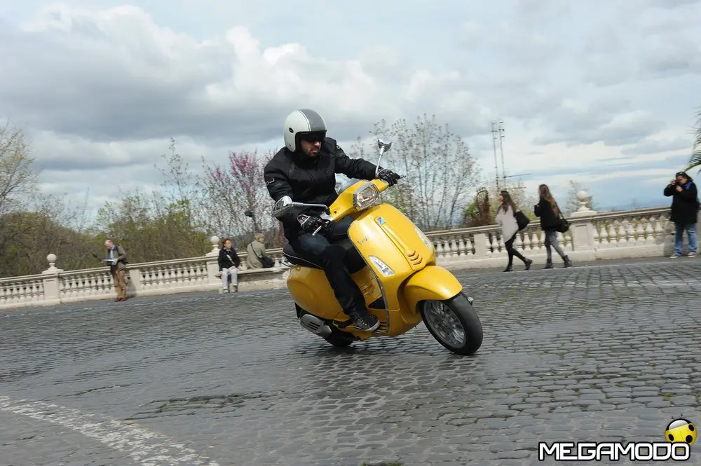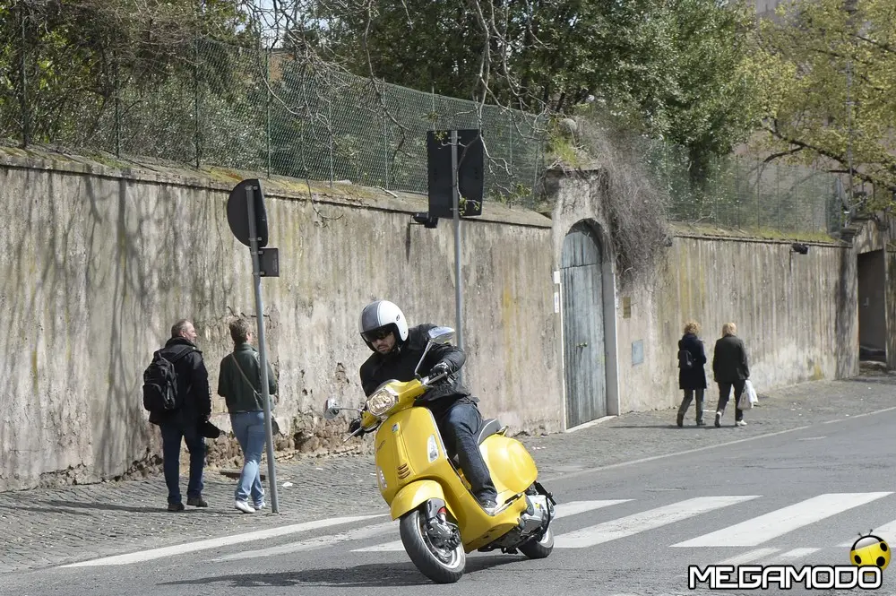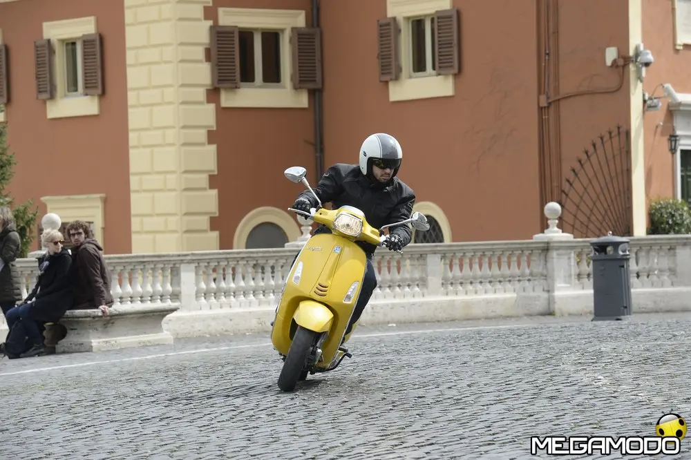 Il risultato è una grafica nuova, sportiva, un manubrio che torna ad avere una divisione orizzontale come le Vespe vintage, e poi abbiamo voluto lavorare sui bracciali dove sono inseriti i comandi elettrici, questi ricordano il vecchio cambio comando frizione delle vespe degli anni ’60. I dettagli diventano sportivi come la cravattina sullo scudo frantale così come la molla della sospensione anteriore, nuove maniglie passeggero, più adatte alla posizione di quest’ultimo, nuovo vano di carico più ampio che ospita un casco jet con visiera. L’ergonomia è stata aumentata, c’è molto più spazio tra sella e contro-scudo, quindi il pilota ha più spazio per gambe e piedi. Nel posteriore troviamo luci a LED per lo stop e la luce di posizione che disegna una V, gli indicatori di direzione a filo carrozzeria molto piccoli. Per quanto riguarda la gamma colori abbiamo: bianco, nero, rosso, blu e giallo. Inoltre abbiamo la sella monoposto, i cerchi bicolore e la cravatta sullo scudo è stata colorata come la 50 Special. Non potevano mancare il parabrezza alto, il bauletto, la pedana, il supporto smartphone, degli elementi cromati di protezione. Abbiamo sviluppato anche delle borse in cuoio e poi c’è una coperta impermeabile che si può attaccare al retro della Vespa per fare un pic-nic. Vespa ha anche una linea di caschi che riprendono i colori del veicolo. Ma Vespa è anche un mondo lifestyle e comprende, quindi, anche una linea di abbigliamento.”