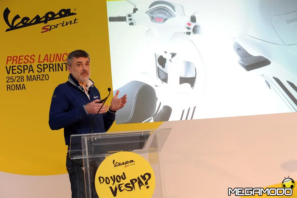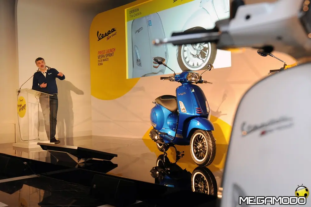 Come si fa a rendere sempre attuale un oggetto con così tanta storia alle spalle? Ce lo spiega Marco Canepa del Centro Stile Gruppo Piaggio: “Vespa Sprint affonda le proprie radici nel passato, riprende le forme della 946, la cura del dettaglio, la raffinatezza. E’ nata una Vespa sportiva e dinamica adatta alla città, una vera Vespa. E’ una vera Vespa perché c’è la tipica forma ad omega nella parte centrale, le fiancate discendenti e la coda a punta, ma ciò che salta all’occhio è la dimensione delle ruote. Una 12” anteriore e posteriore, ruote grandi mai montate su un body piccolo. Le tappe posteriori disegnano luci ed ombre. Non ci siamo limitati a disegnare la carrozzeria, ma siamo intervenuti anche su aspetti tecnici come la marmitta che è una reinterpretazione di quella a siluro. Vespa non è solo carrozzeria, forma e metallo, ma è anche dettagli: il faro torna ad essere trapezoidale, come era la Sprint degli anni’70 o la 50 Special. Il quadro di bordo si ispira alle Vespa del passato ma con una tecnologia moderna con un tachimetro analogico ed un display digitale dove sono racchiuse tutte le funzioni.