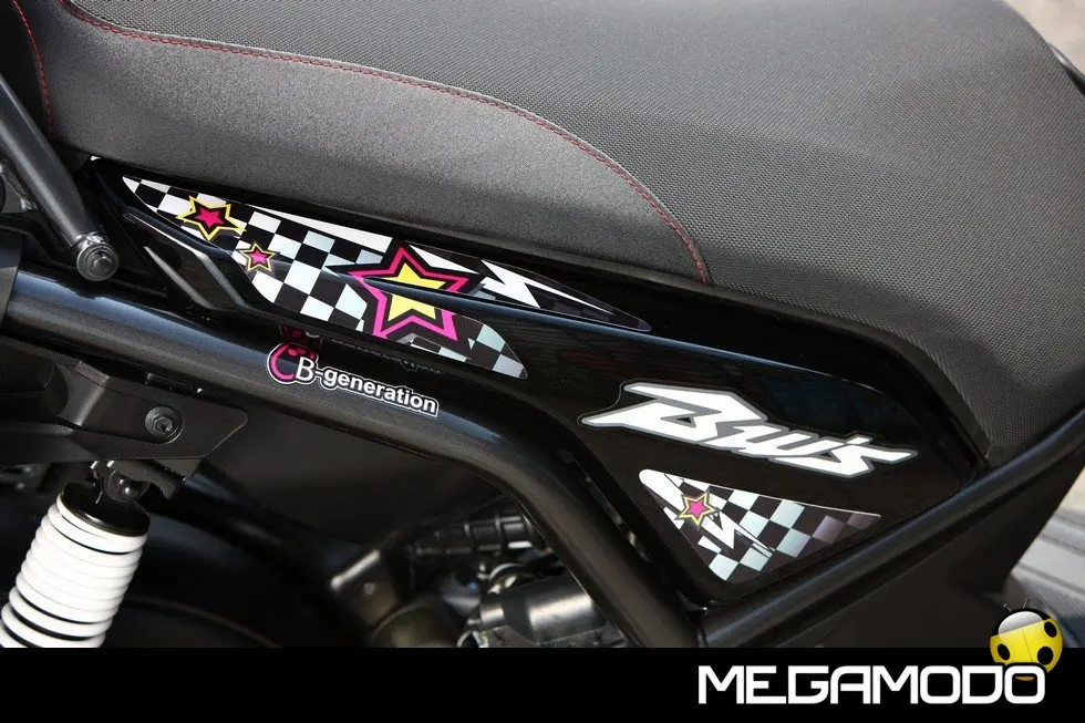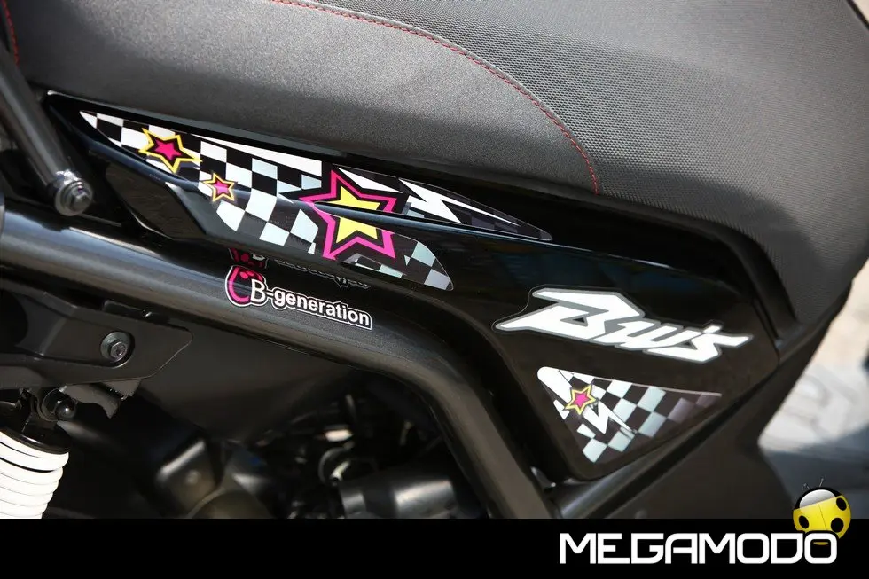 BW’s B-generation 125. Caratteristiche principali: • 5 grafiche originali personalizzabili a piacimento: Bad Skull, Doll Skull, Pop Star, Rock Star, Bar Code • Nuovo, grintoso 125 cc da città • Design esclusivo con telaio a vista • Motore raffreddato ad aria, brillante e pulito, da 125 cc, a 4 tempi • Iniezione elettronica • Telaio leggero per una grande maneggevolezza • Pneumatici da 12 pollici dal grande grip, adatti a tutte le superfici • Doppio ammortizzatore posteriore, progettato per affrontare anche i fondi più sconnessi • Doppio faro anteriore per vedere ed essere visti • Spazio in abbondanza per pilota e passeggero • Vano sottosella per casco integrale • PREZZO: 3.090 € f.c.