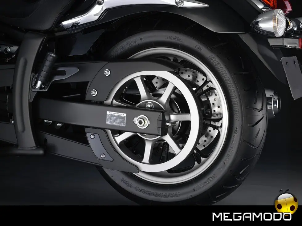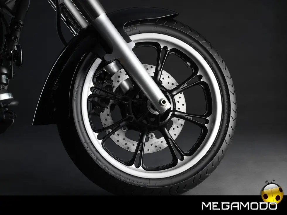 Nuovi cerchi anteriore e posteriore in alluminio I nuovi cerchi anteriore (18 x MT3,50) e posteriore (16 x MT4,50) a 8 razze completano il design classico da cruiser leggera, e permettono di ridurre i pesi non sospesi, migliorando la reattività delle sospensioni. Le razze si sdoppiano per conferire un design che evidenzia la personalità di un modello decisamente diverso dagli altri.