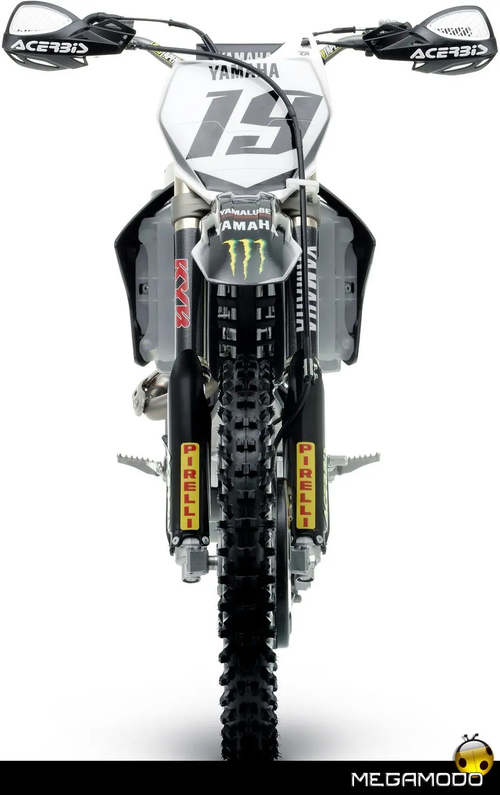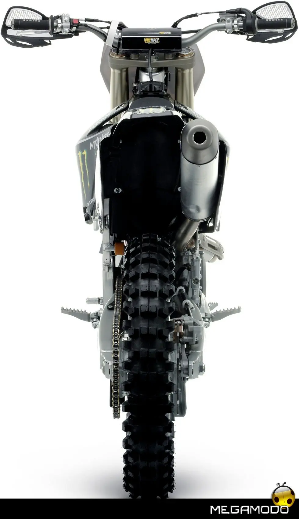 • Livrea nera, replica delle moto ufficiali: Serbaotoio/prese d'aria Fianchetti Parafanghi anteriore e posteriore • Set adesivi Team Yamaha Monster Motocross • Paramani con supporti in alluminio • Protezione del freno a disco anteriore in fibra di carbonio • Sella nera modello “ufficiale” • Manubrio racing come quello del Team • Protezioni steli forcella in fibra di carbonio • Paracatena in fibra di carbonio • Protezione sotto il telaio in fibra di carbonio